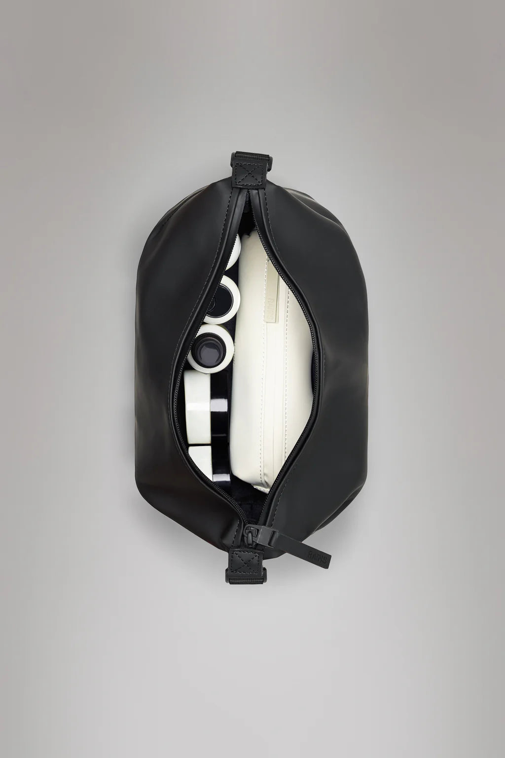 Hilo Wash Bag fra Rains er en toalettmappe og det minste designet i Weekend Bag-serien. Toalettmappen har et minimalistisk design med sidemonterte spenner som kan justeres for å komprimere vesken, og et romslig hovedrom med god plass. Den er vanntett mot lett regn, med en vannsøyle på 8000 mm.