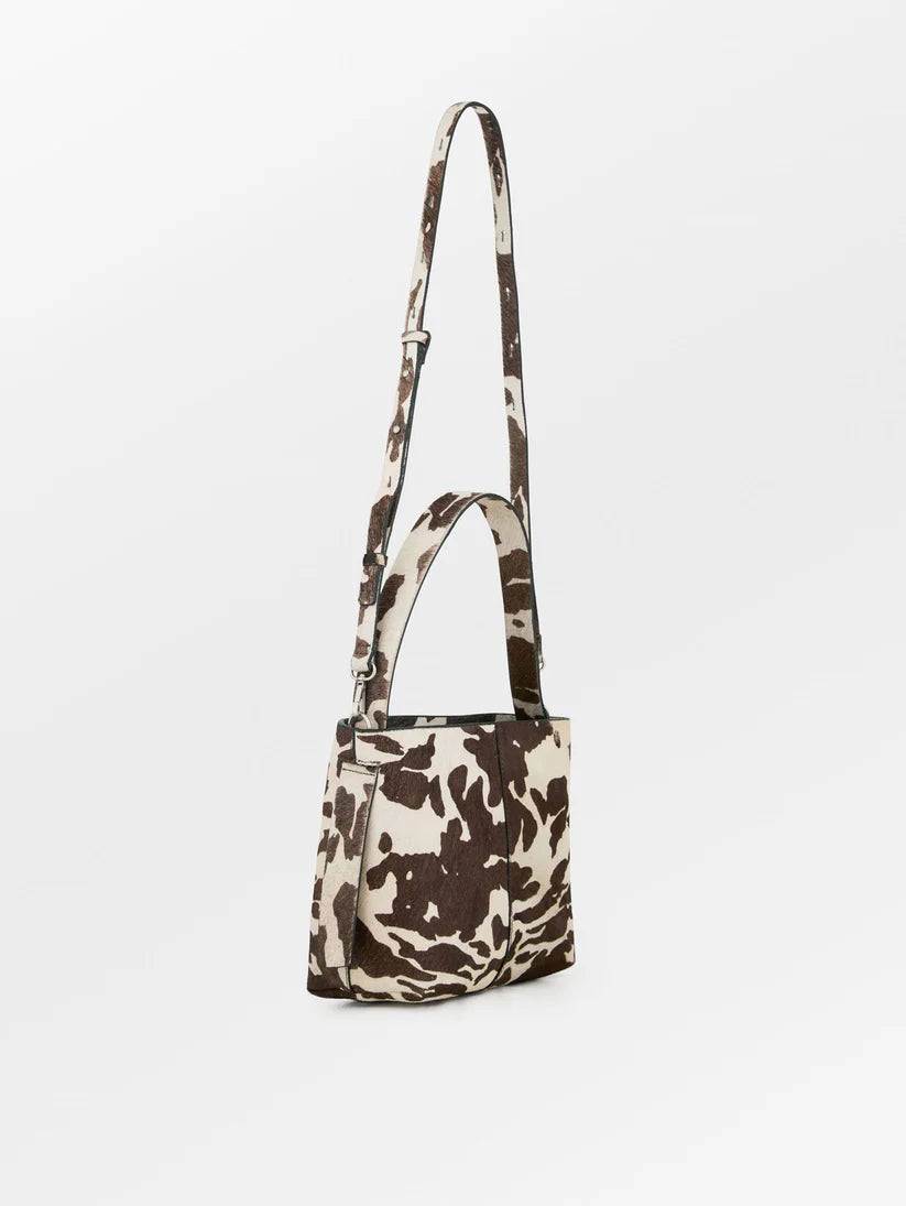 Texas Leather Small Fraya Bag fra Beck Söndergaard er en stilfull veske laget av 100% kuskinn, med et iøynefallende kuprint i fargen Hot Fudge Brown. Med målene 24 x 22 cm rommer den det viktigste du trenger, og passer perfekt både til hverdags og mer pyntede anledninger. Den justerbare og avtagbare stroppen gjør at vesken kan bæres både som crossbody og skulderveske, noe som gjør den til et praktisk og allsidig valg. Med sitt unike uttrykk tilfører Texas Leather Small Fraya Bag en kul edge til ethvert antrekk – samtidig som den holder stilen elegant og tidløs.