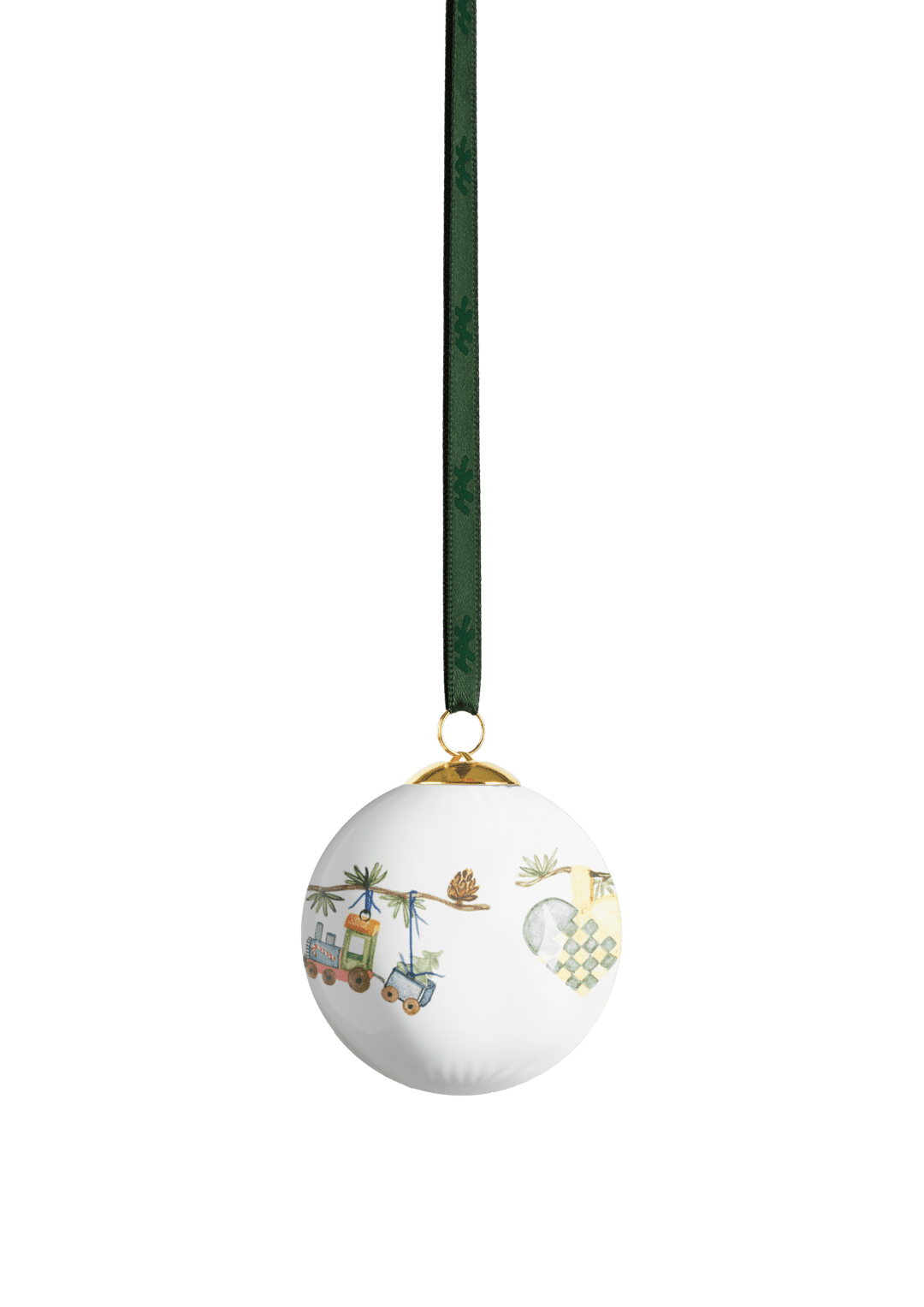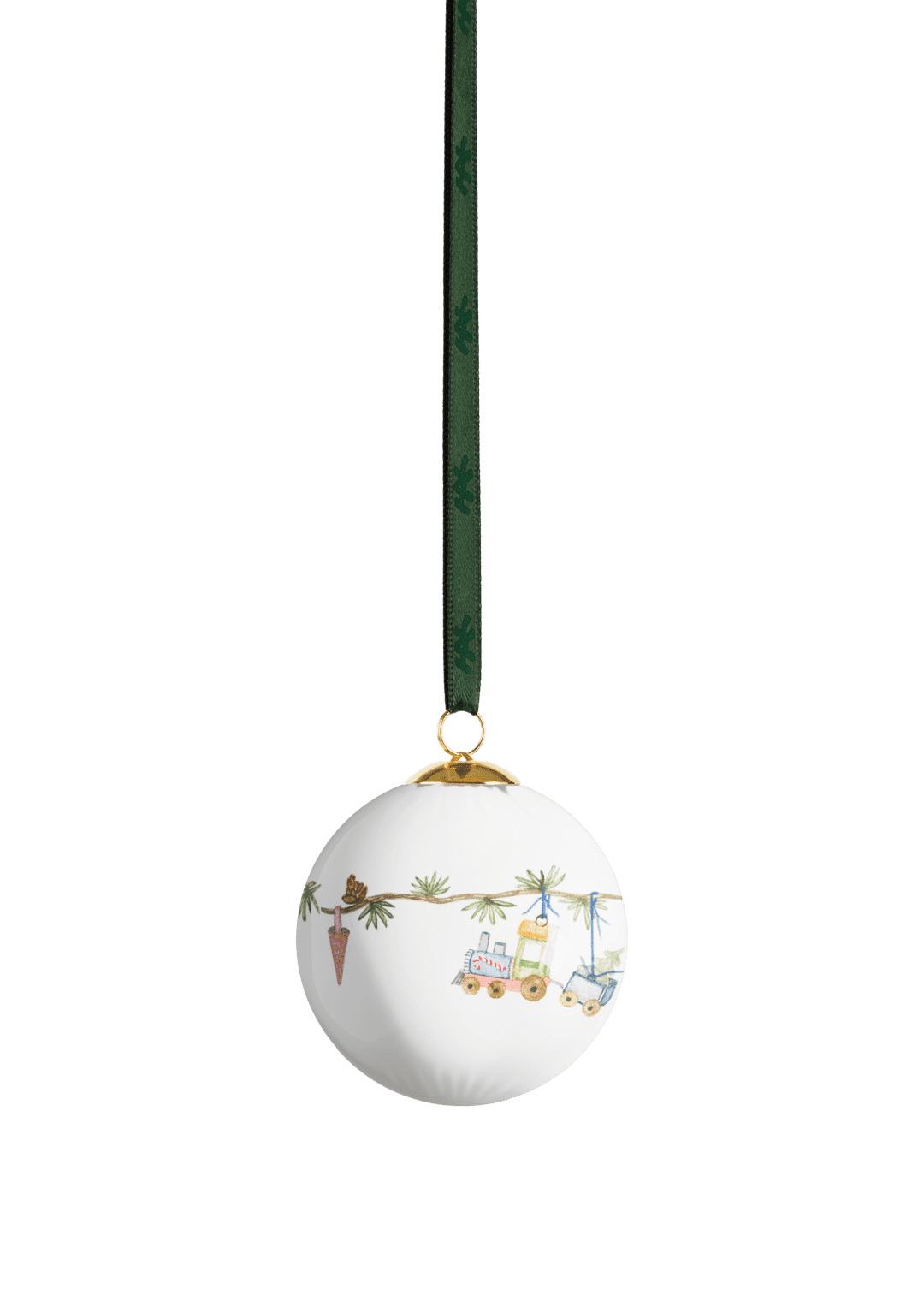 Hammershøi Christmas-julekulen 2024 fra Kähler er en hyllest til den autentiske, nostalgiske julen. Julekulen har en diameter på 6 cm og er dekorert med et stort, flettet julehjerte, et leketog og en sjarmerende liten nisse.