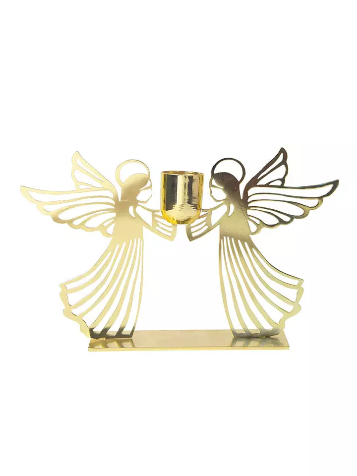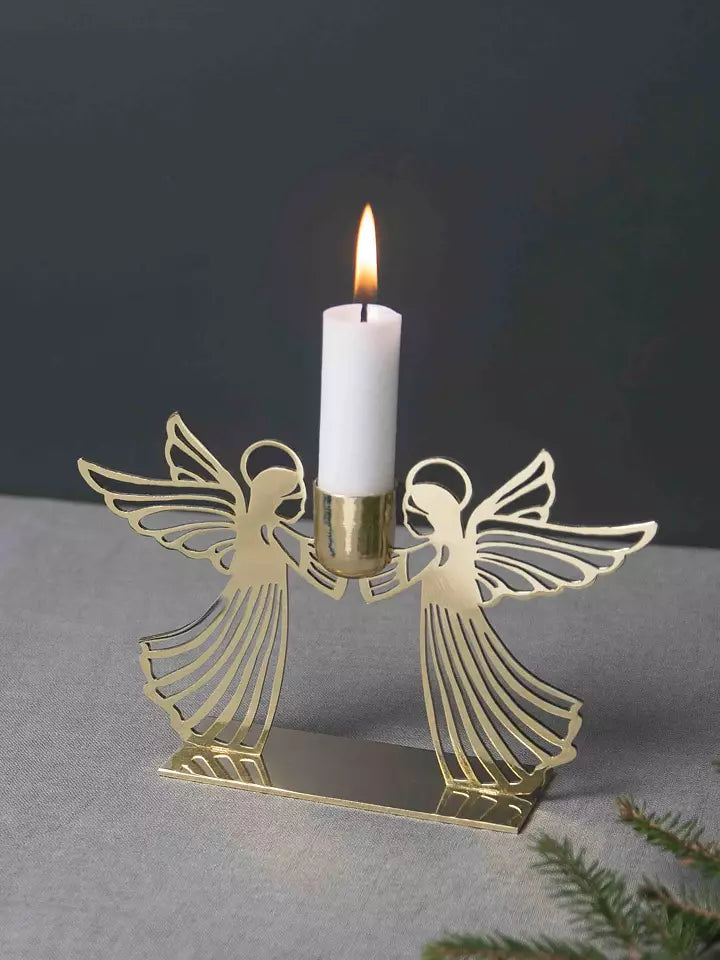 Lysestake i gull fra Pluto Design med to flyvende engler. En stilren lysestake for høytiden.