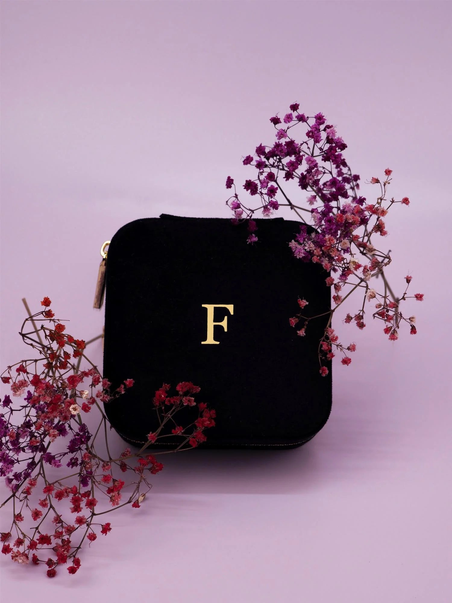 Elegante og kompakt smykkeskrin i klassisk sort fra Wahl West. Laget i myk fløyel og personalisert med bokstav i gullprint. Glidelåslukkingen gjør den enkel å åpne, mens interiøret tilbyr praktisk oppbevaring. Super for å holde dine smykker organisert og trygg mens du er på farten. Og den perfekte gaven med en personlig touch!