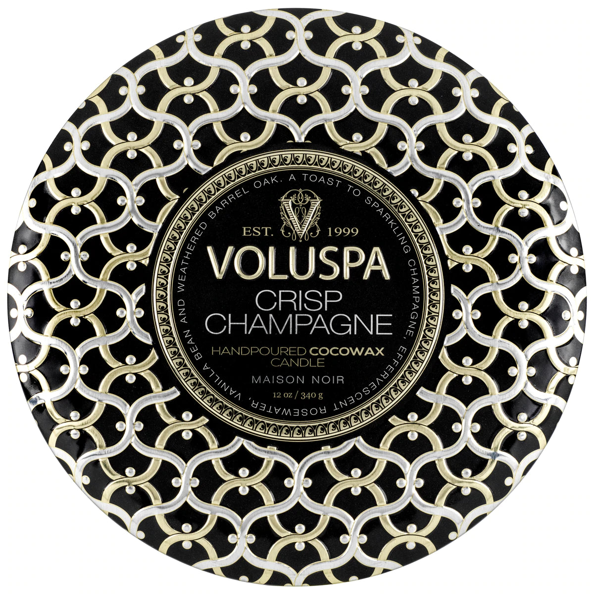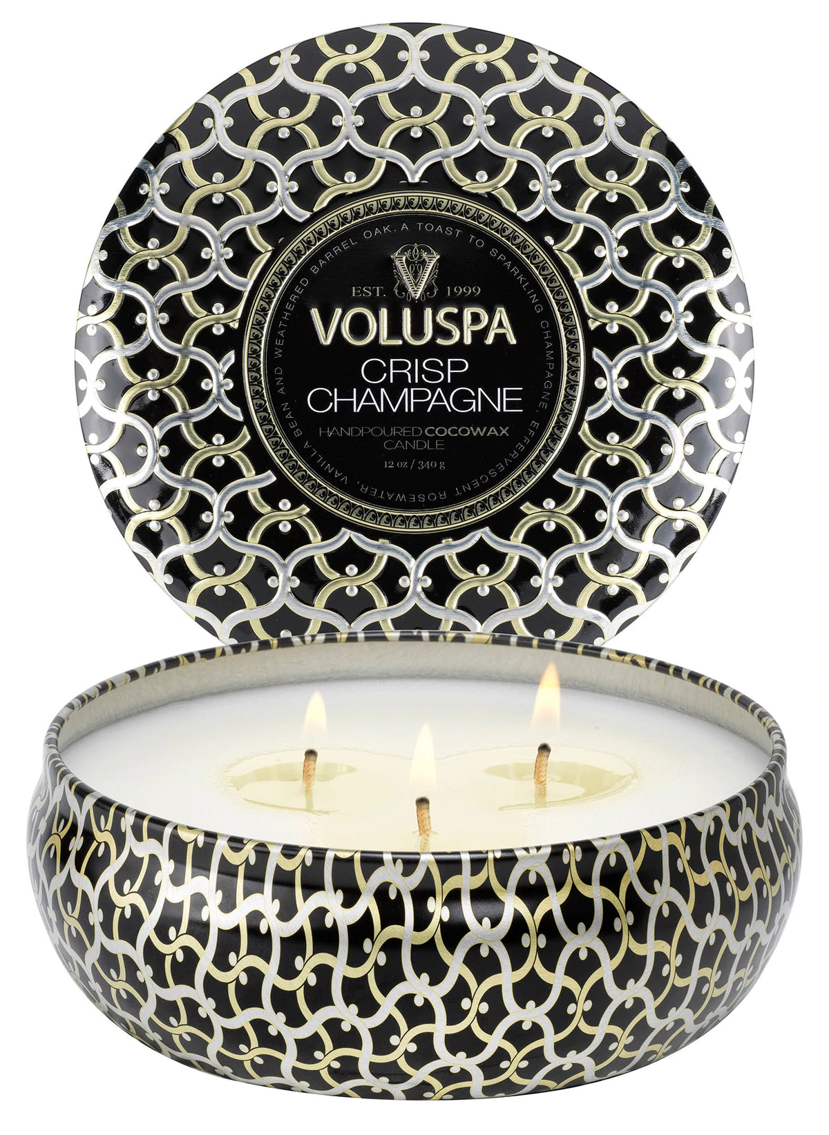 Crisp Champagne 3 Wick Tin Candle duftlys fra Voluspa med noter av glitrende brut champagne, vanilje og barrel oak.