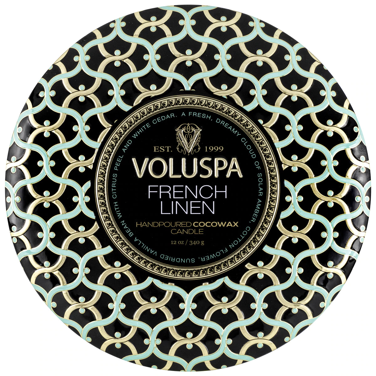 3 Wick Tin Candle duftlys fra Voluspa med noter bomullsblomst, hvitt sedertre og soltørket vaniljestang.