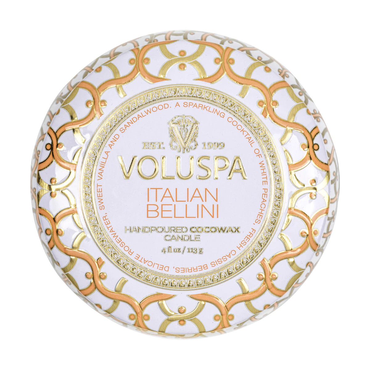Mini Tin Candle duftlys fra Voluspa med noter av musserende vin og hvit fersken.