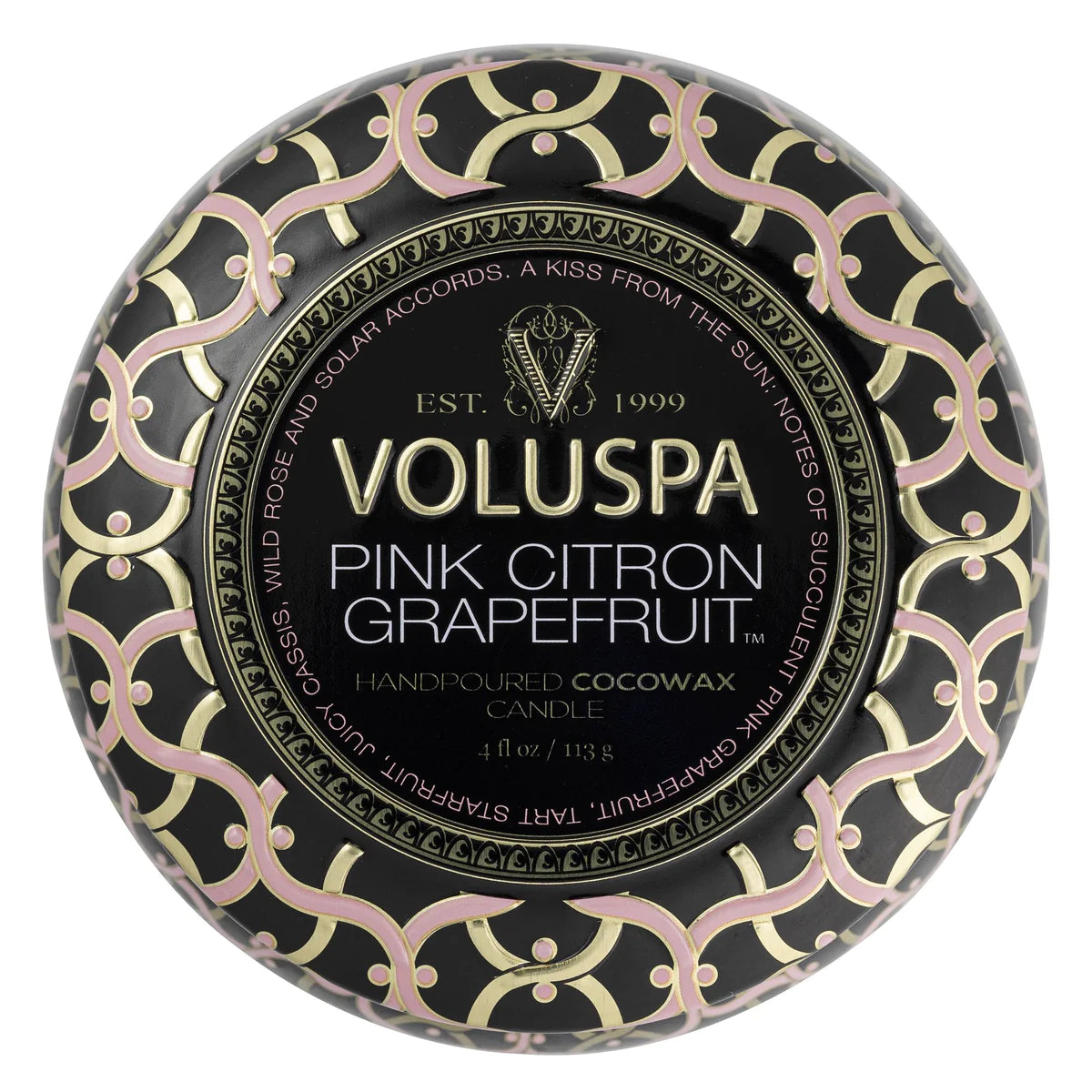 Pink Citron Grapefruit Mini Tin Candle fra Voluspa med noter av moden sitrongrapefrukt, tertekassis og subtil rose.