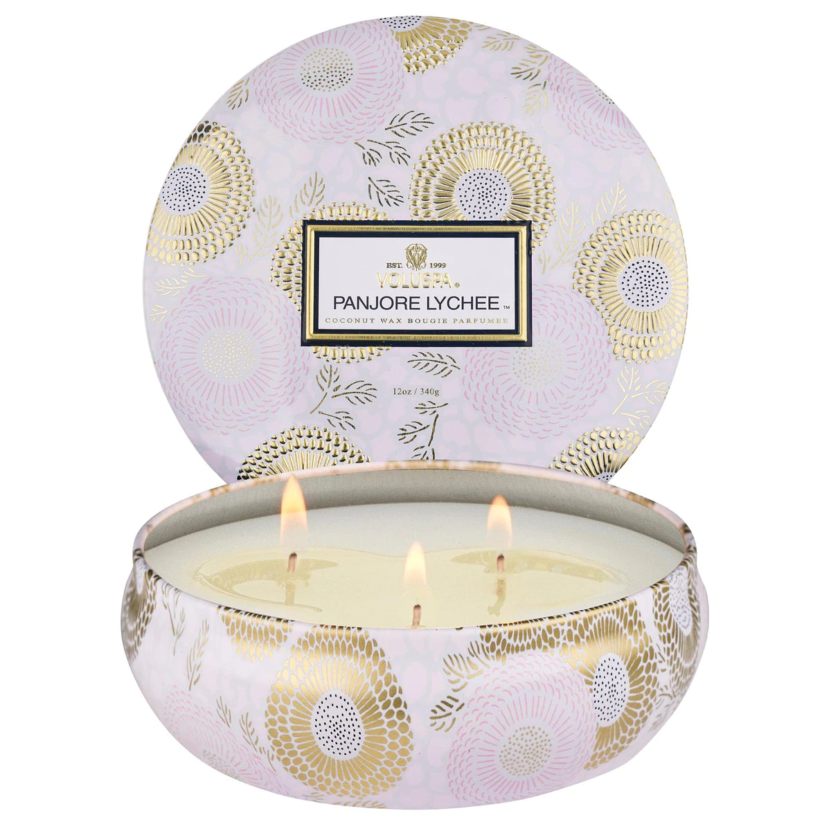 Panjore Lychee 3-Wick Tin Candle duftlys fra Voluspa med noter av panjore litchi, cassis og saftig asiatisk pære.