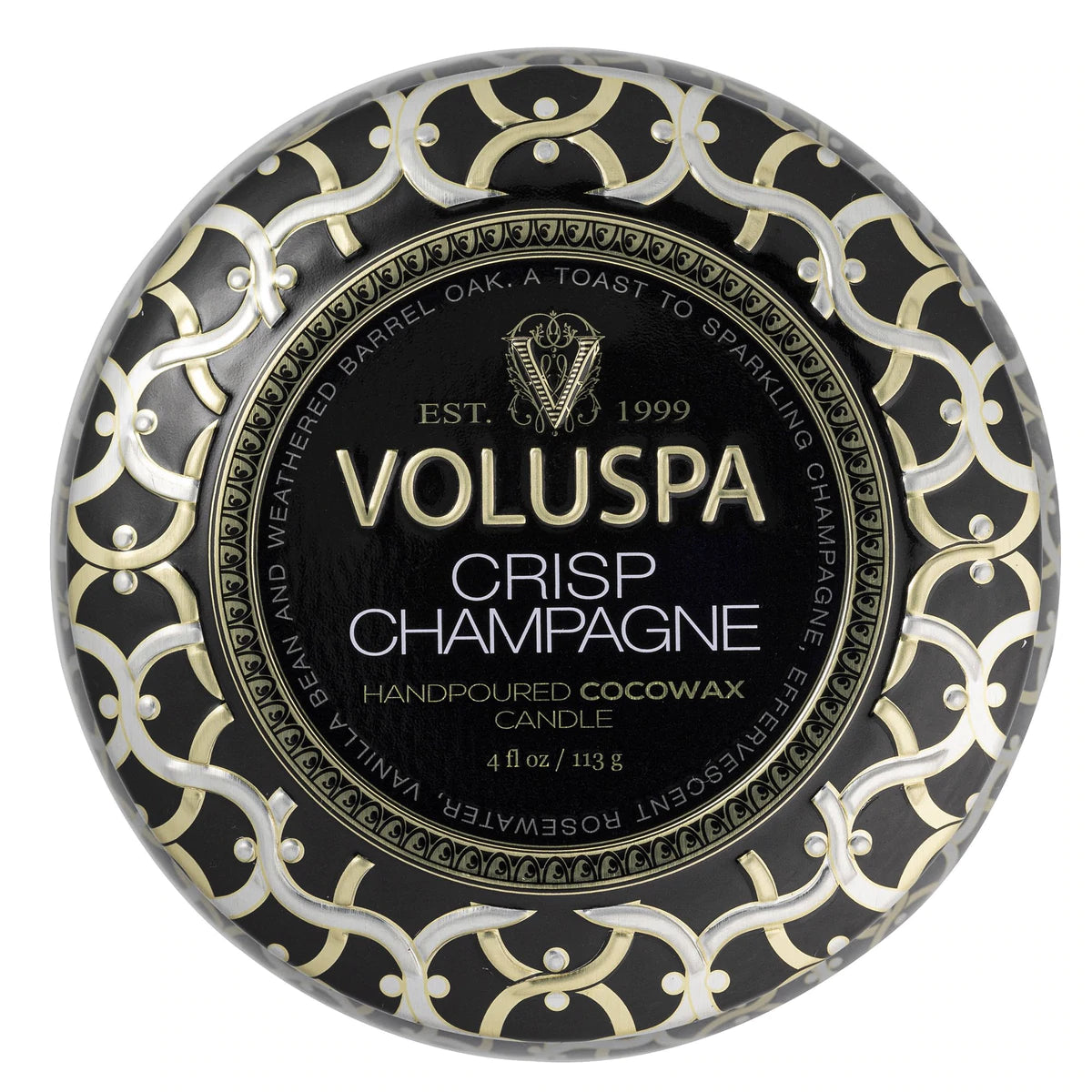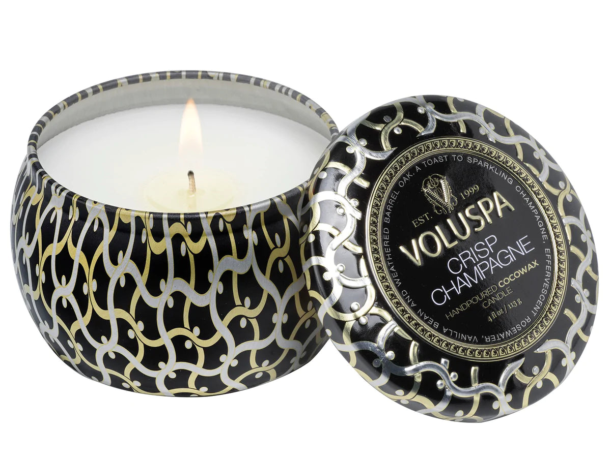 Crisp Champagne Mini Tin Candle duftlys fra Voluspa med noter av glitrende brut champagne, vanilje og barrel oak.