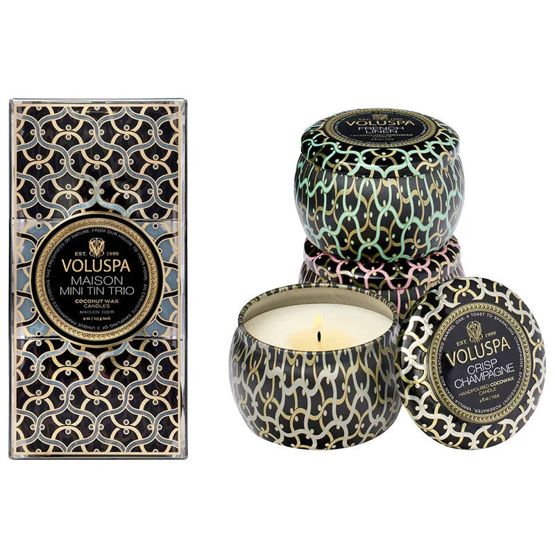 Maison Noir Minitin Giftset fra Voluspa – et tredelt gavesett med duftene Crisp Champagne, French Linen og Freesia Clementine. Duftlysene kommer i en dekorativ gavepakke perfekt for å gi bort til noen du er glad i.