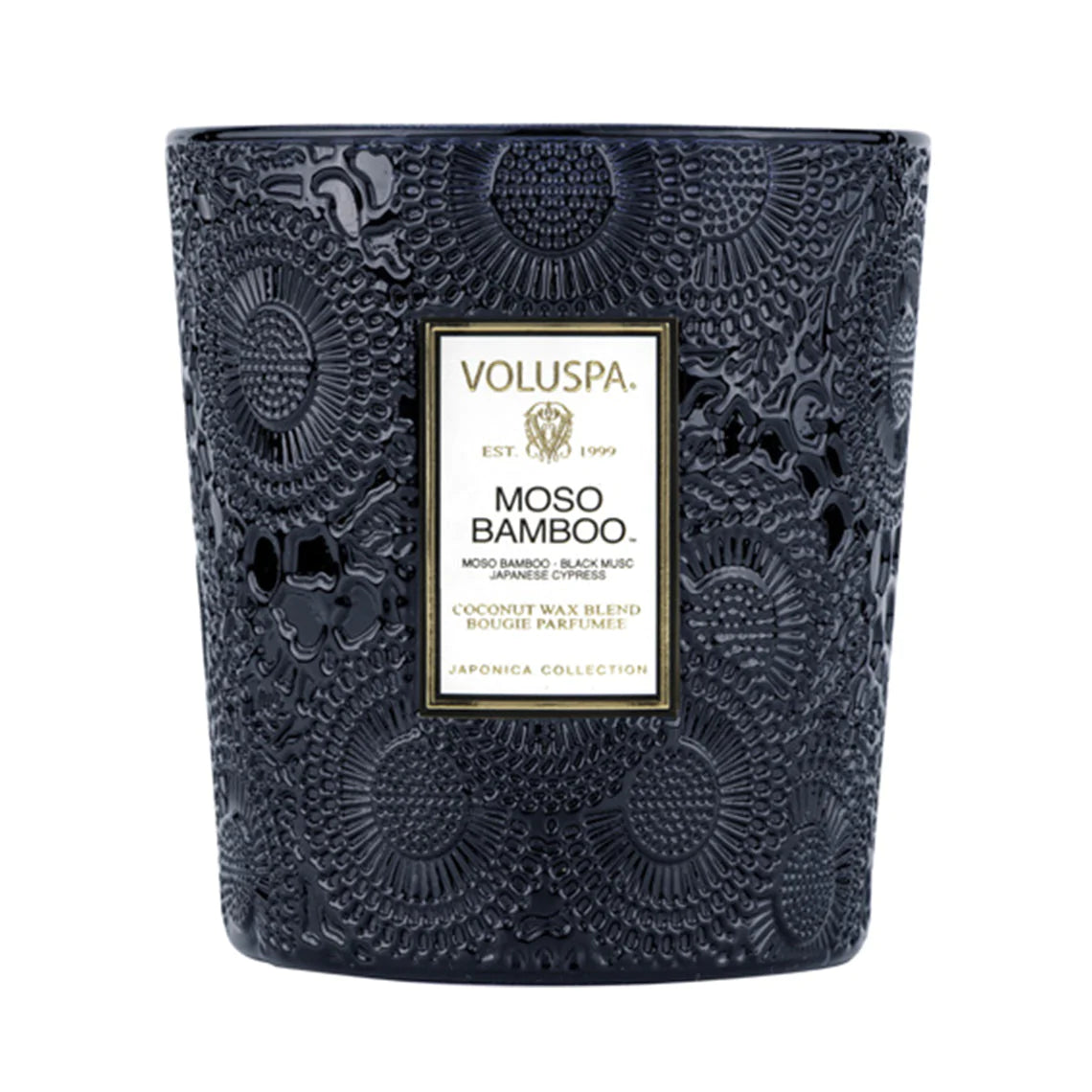 Moso Bamboo Boxed Classic Candle duftlys fra Voluspa med noter av moso bambus, svart musk og japansk sypress.
