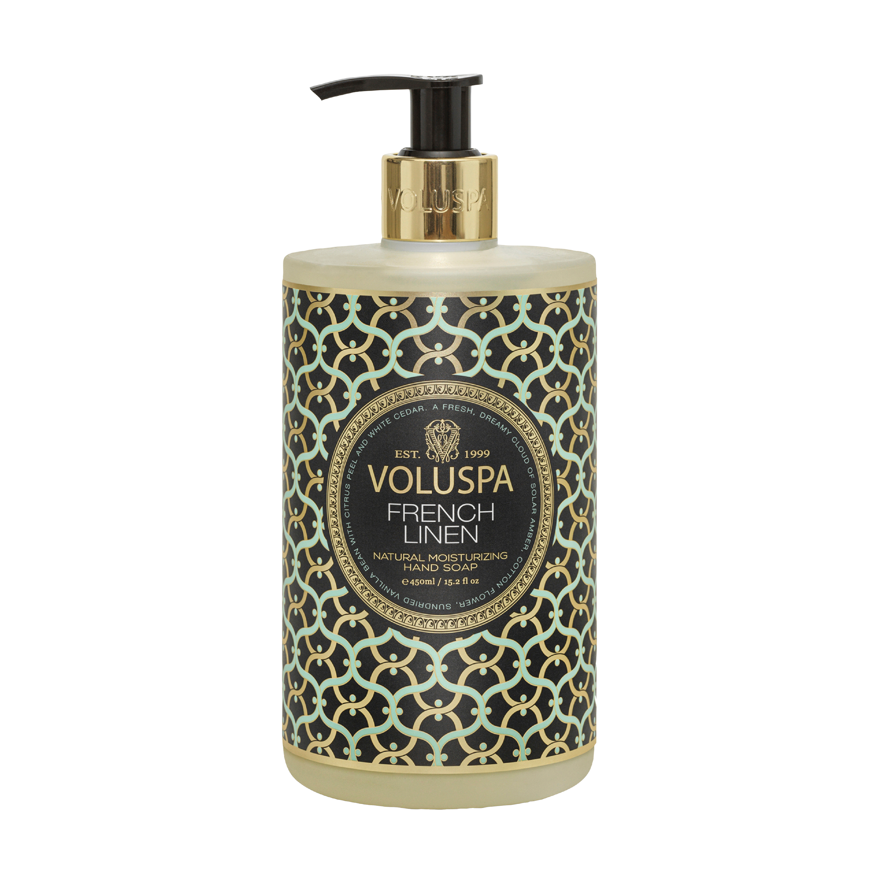 French Linen Maison Hand Wash fra Voluspa med noter bomullsblomst, hvitt sedertre og soltørket vaniljestang.