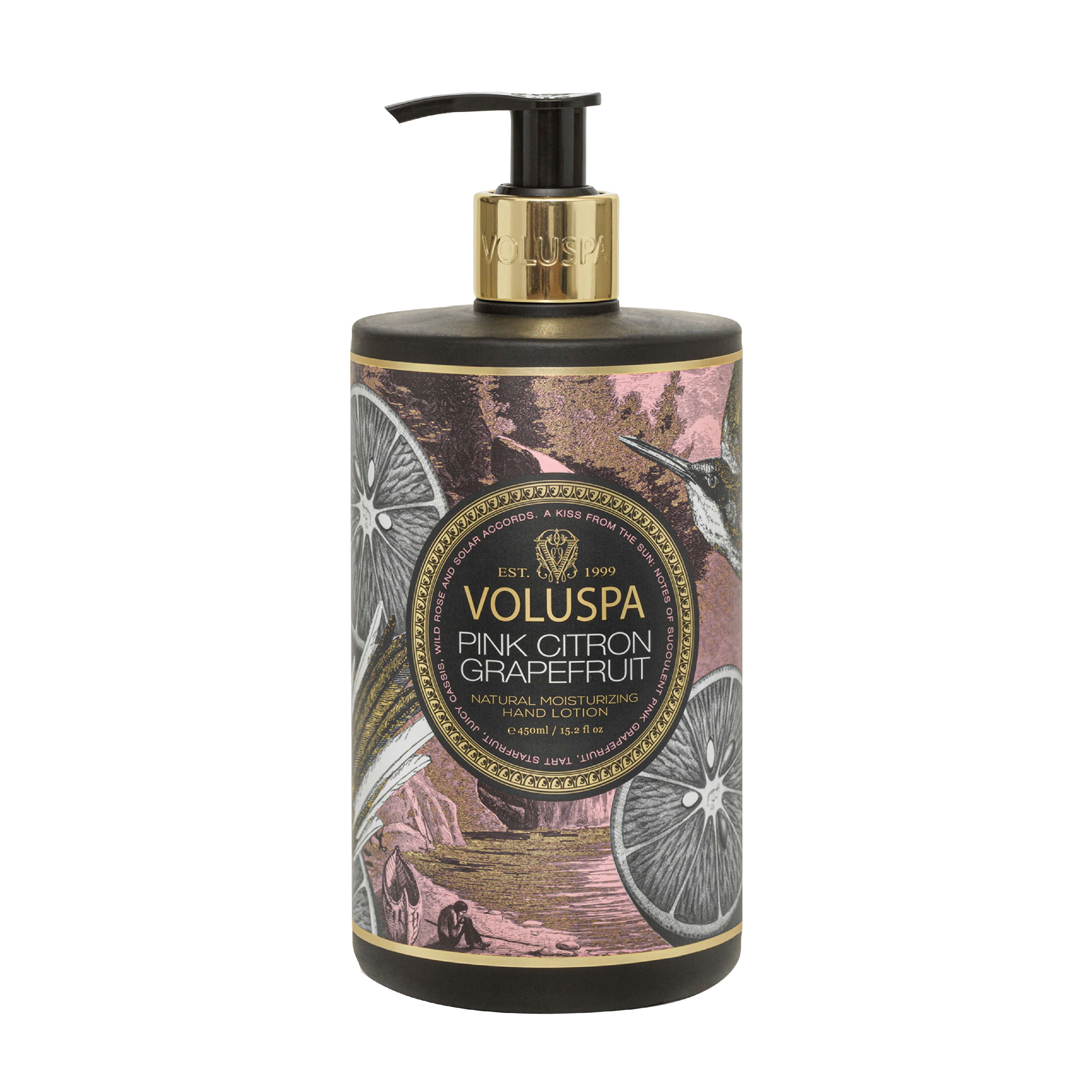 Pink Citron Grapefruit Maison Hand Lotion fra Voluspa med noter av moden sitrongrapefrukt, tertekassis og subtil rose.