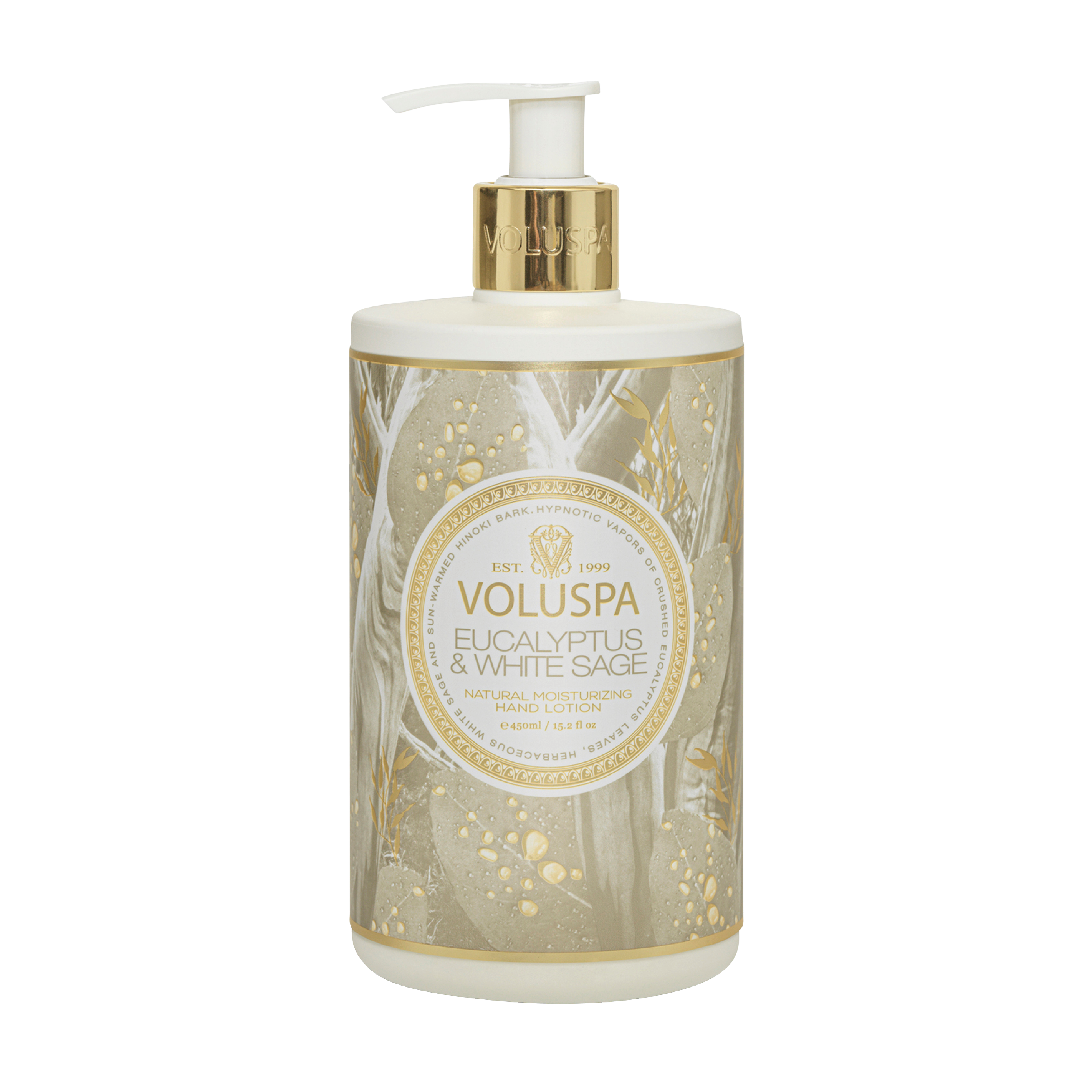 Eucalyptus & White Sage Maison Hand Lotion fra Voluspa med noter av eucalyptus, kardemomme, hvit salvie og solvarmet hinoki bark.