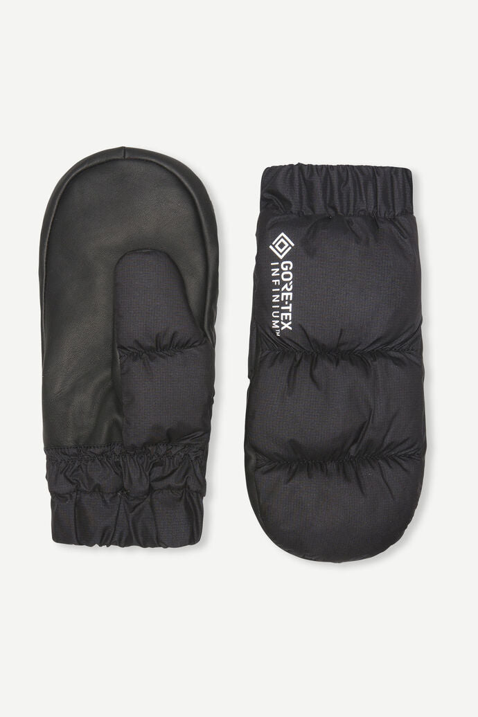 Vatterte vannavstøtende og vindtette votter med elastiske mansjetter. Detaljert med PrimaLoft polstret isolasjon, lærhåndflater, fleecefor og Gore-Tex Infinitum logotrykk.