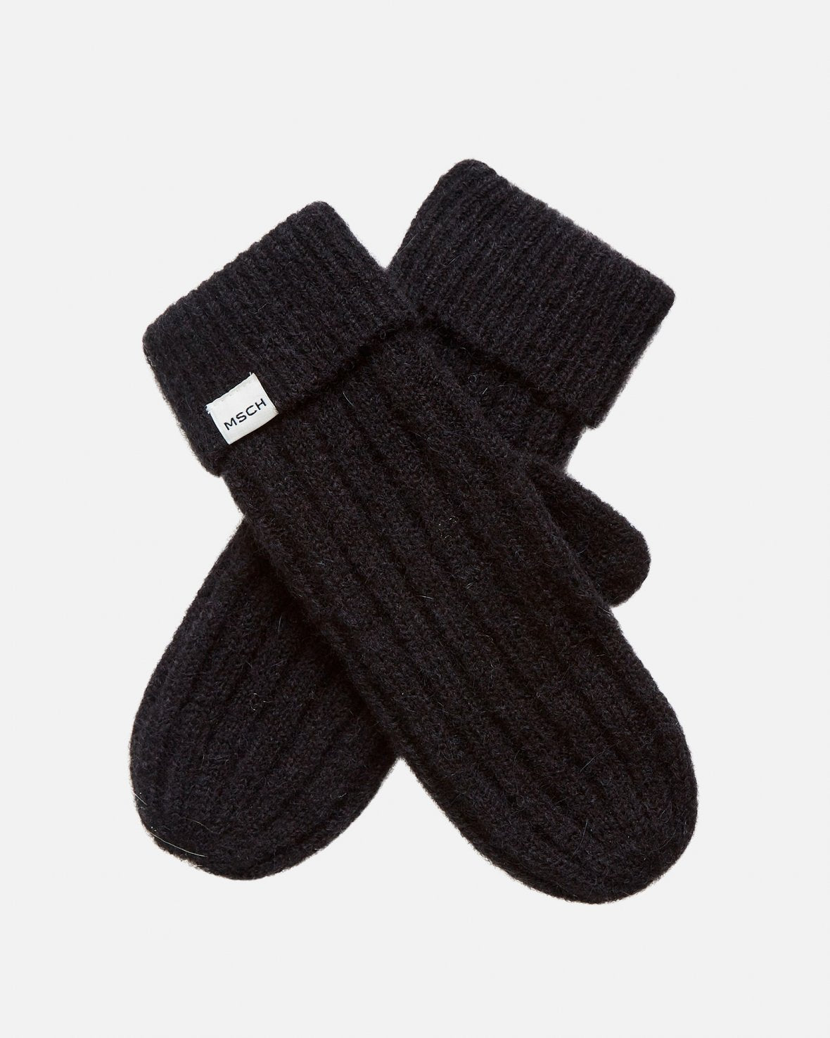 Hope Mittens fra MSCH Copenhagen er stilrene votter i ullmiks. Vottene har en ribbet struktur, nedbrettet kant, og en påsydd Moss Copenhagen-logo patch.