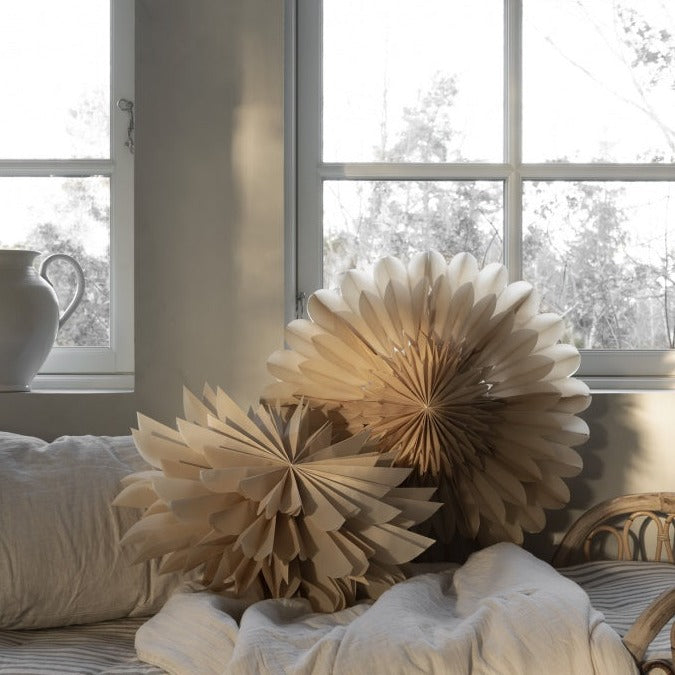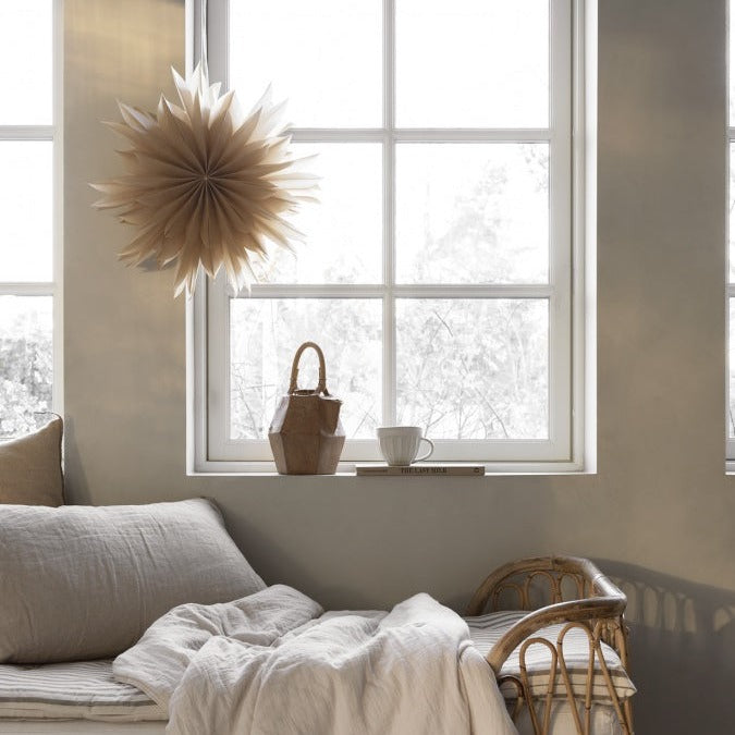 Athena betyr gudinnen for håndverk og som sin slektning Freja, gir den unike bretten en feminin, bølgende og flerdimensjonal form. Stjernen er brettet og frorhåndslimt i et semi-transparent farget papir som ønsker julen velkommen med en åpen og varm omfavnelse.