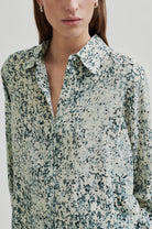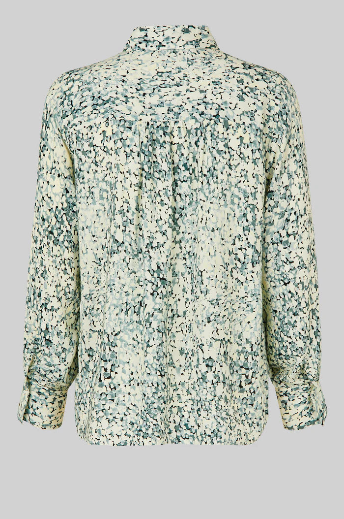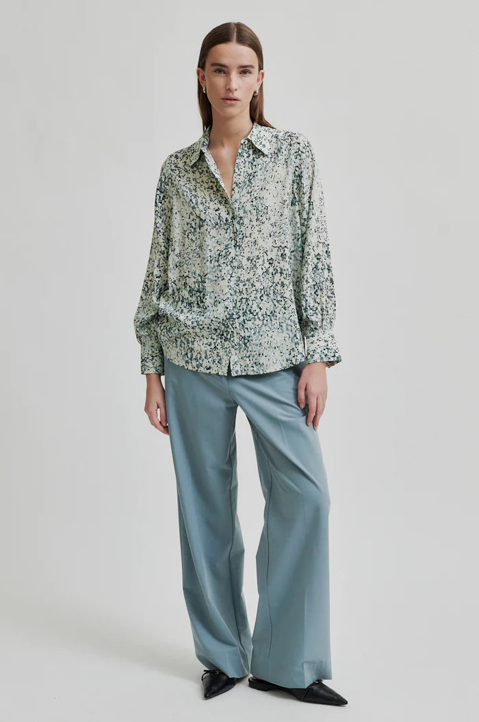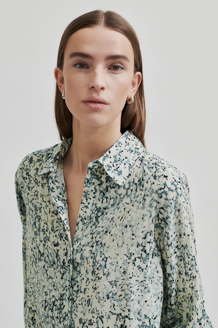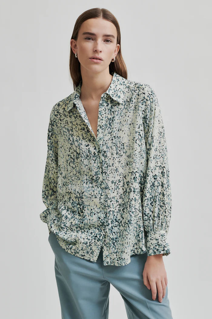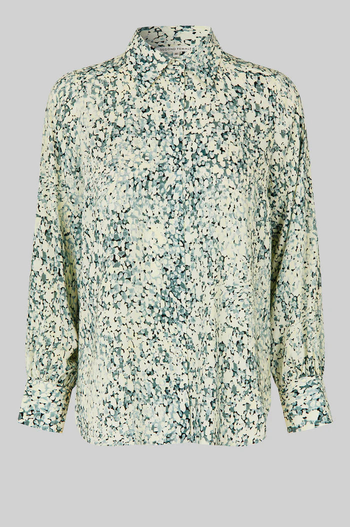 Sisal Shirt fra Second Female er en skjorte med knapper laget i lett og drapert viskose med all-over mønster. Med vanlig krage og knappelukking med dekkede knapper. Lange ermer med rynkede mansjetter og knappelukking. Små rynker ved bærestykkesøm bak. Vanlig passform.