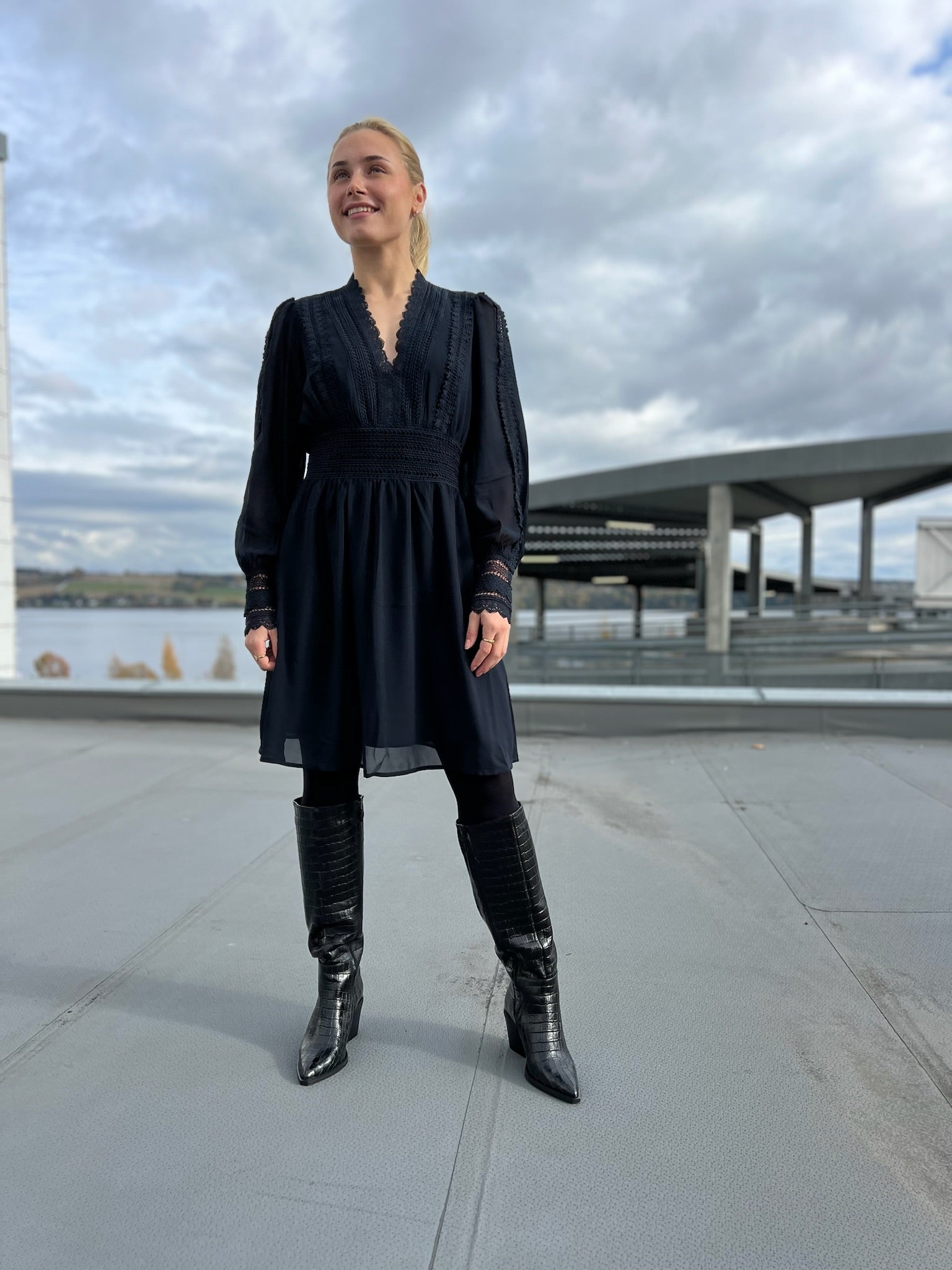 LotusGo Dress fra Gossia er en knelang kjole med vakre blonder og broderidetaljer. Kjolen har V-hals som er innrammet av dekorative blonder som også går nedover toppen av kjolen. Ermene er lange og har matchende blondepynt ved mansjettene, som gir en romantisk og elegant touch. Stoffet er lett og flytende, noe som er med på å gi kjolen et elegant fall. Kjolen har knyting i midjen med sløyfen bak og kan strammes inn etter ønsket passform.