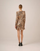 Sequins Mini Dress fra byTiMo er laget i lettfangende paljetter laget på et vakkert vintage-inspirert mønster. Den har en liten lengde, lett tilpasset fasonf med utsvinget kant og lange ermer. Den lukkes bak med glidelås.
