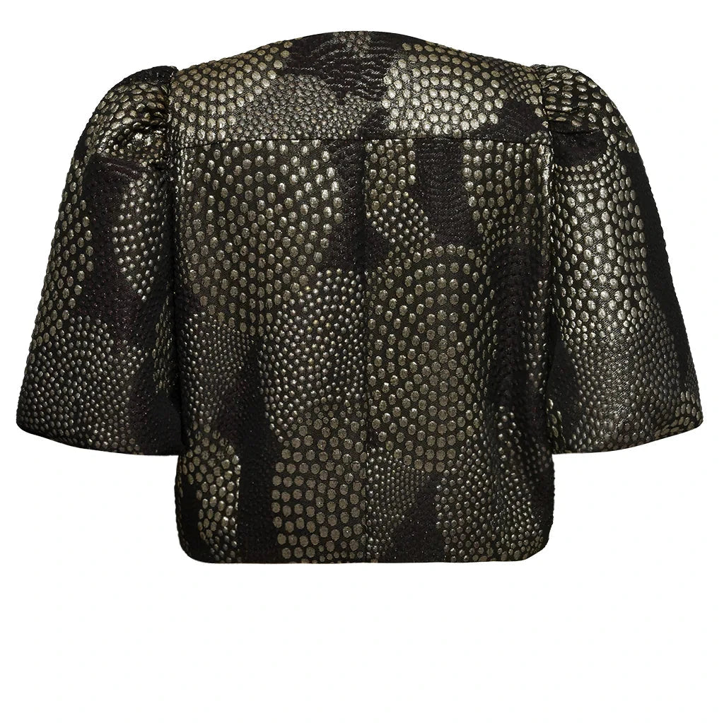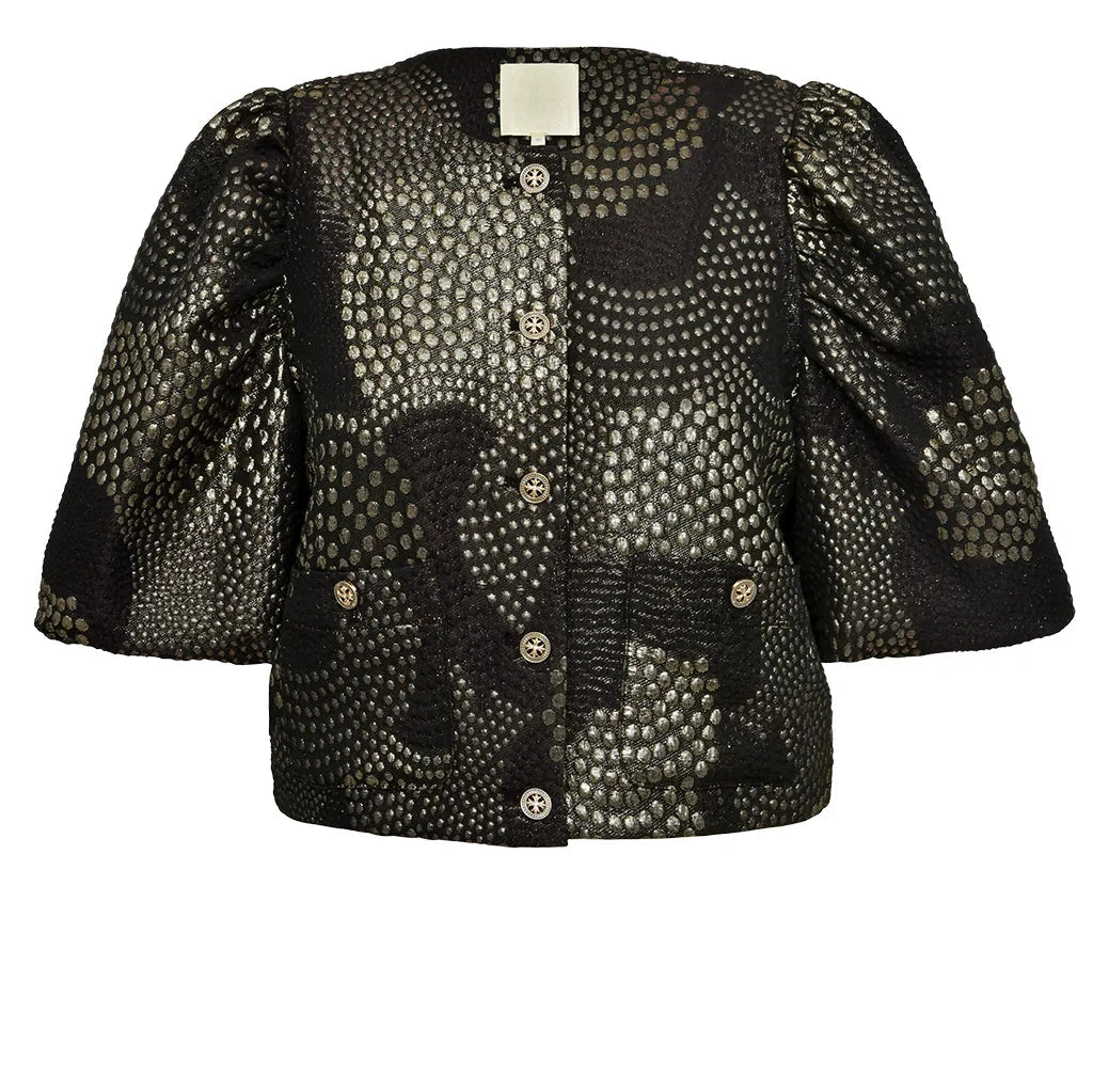 Denne jakken har fine gullknapper med små steiner og metallisk trykk.