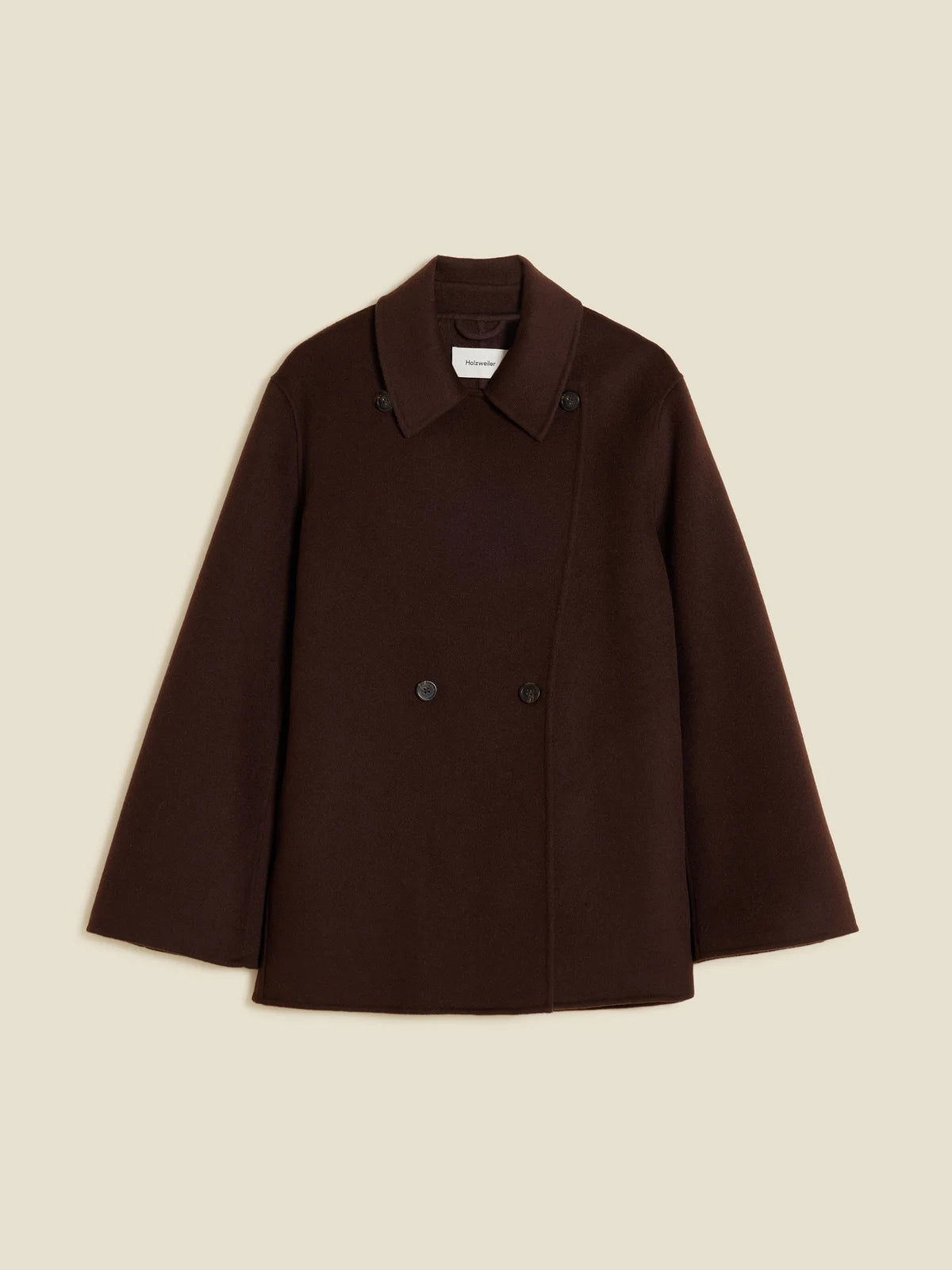 Felsa Wool Peacoat fra Holzweiler er en kort kåpe i tovet ullblanding. Jakken er laget i klassisk silhuett med en dobbeltspent front. Brede jakkeslag og innvendige lommer i sidene.