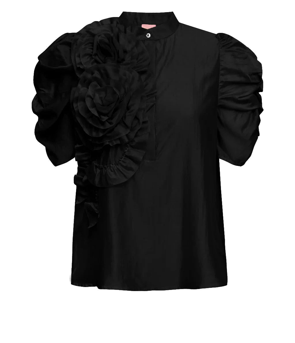AnnsofiGO Blouse fra Gossia er en bluse med korte puffet ermer. Blusen har høy hals som lukkes med knapp foran og en dekorativ blomst på den ene siden av blusen.