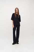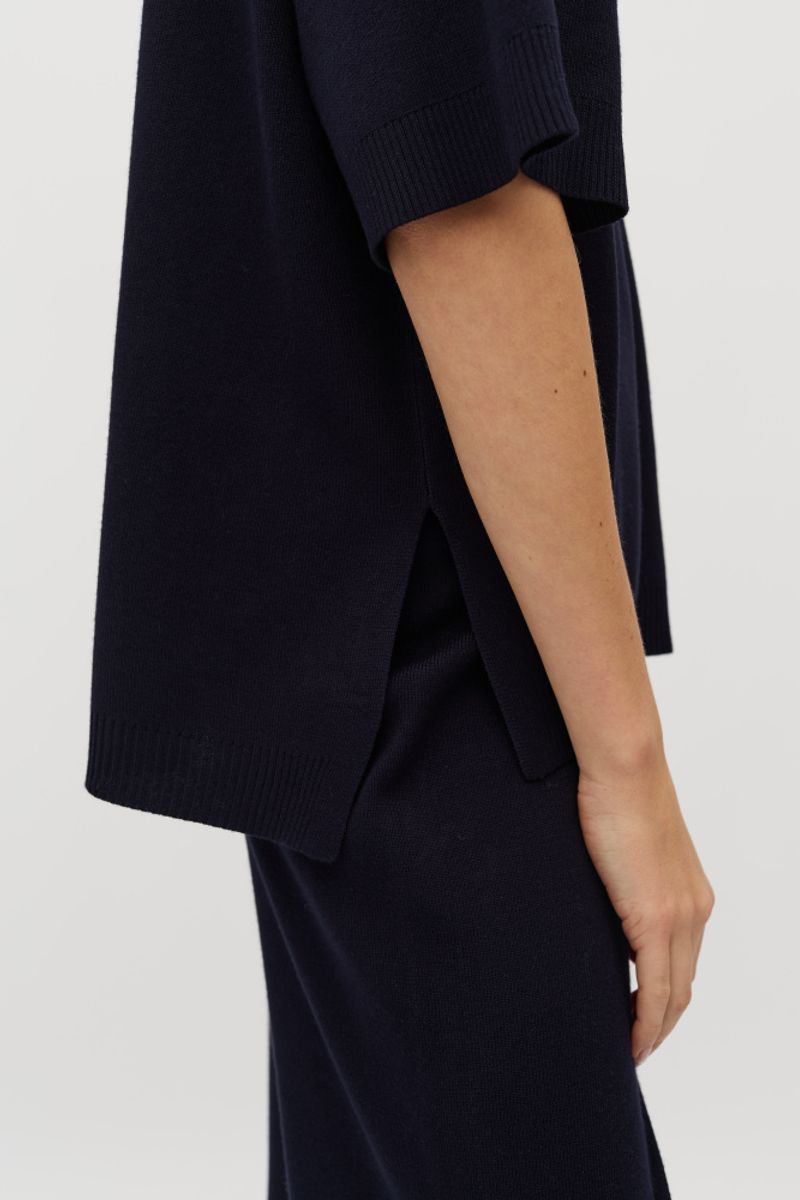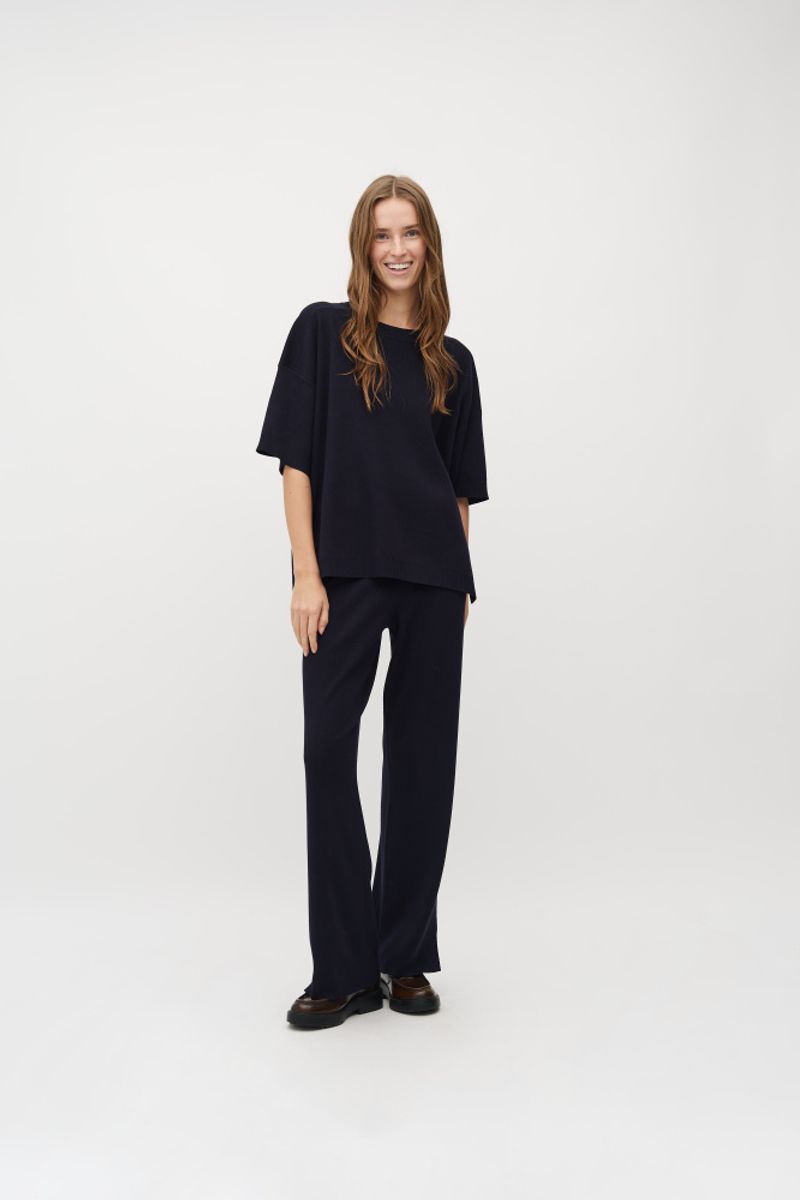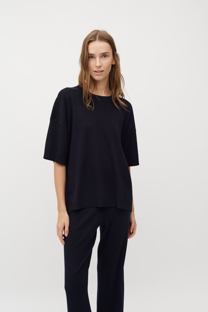 Sitta-M, Jerseya Knit Night Sky fra MbyM er en elegant kortermet strikkegenser laget i en myk og behagelig viskoseblanding. Den har en silkeaktig følelse mot huden og gir et raffinert uttrykk i den mørkeblå fargen. Perfekt å style både til hverdags og festlige anledninger.