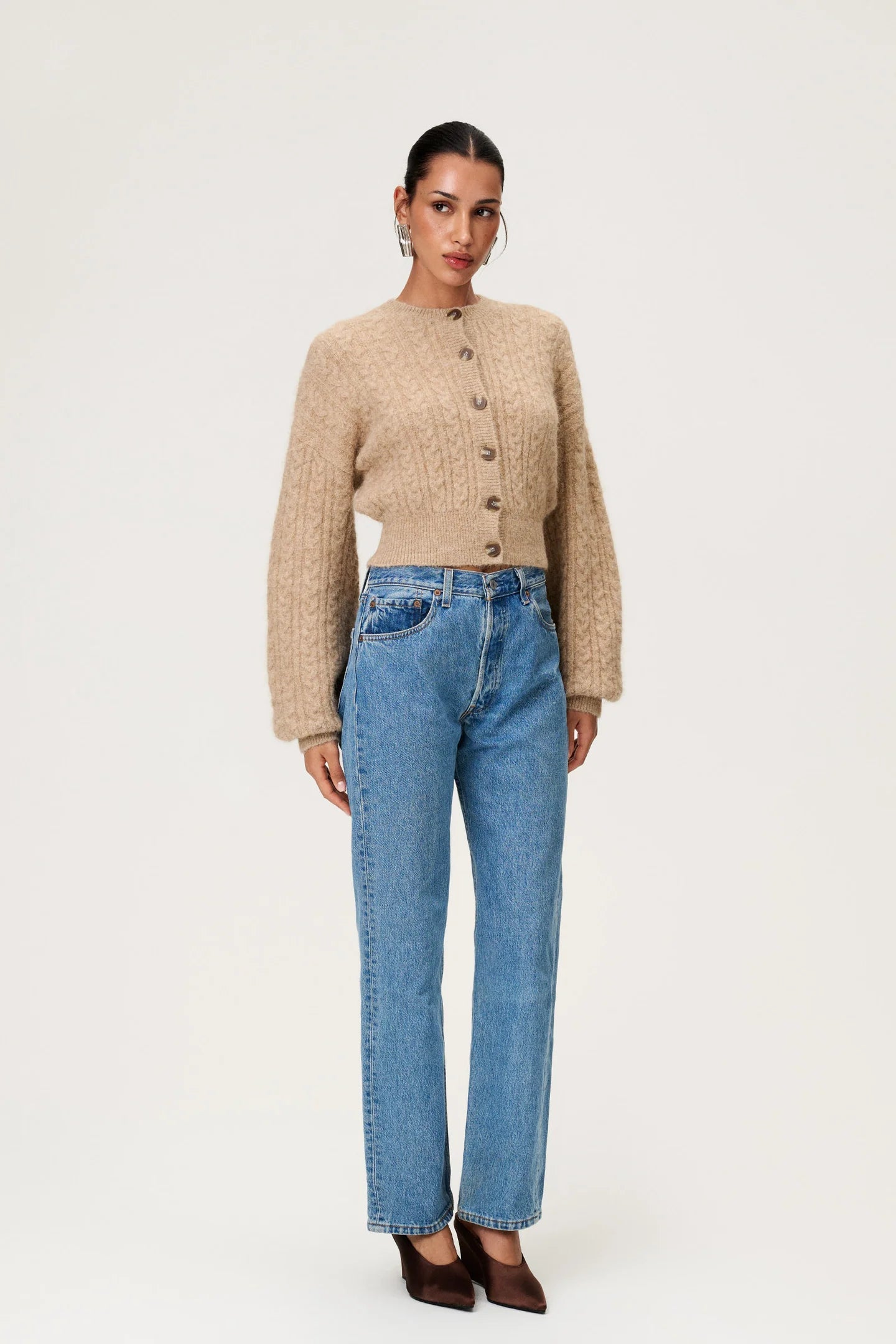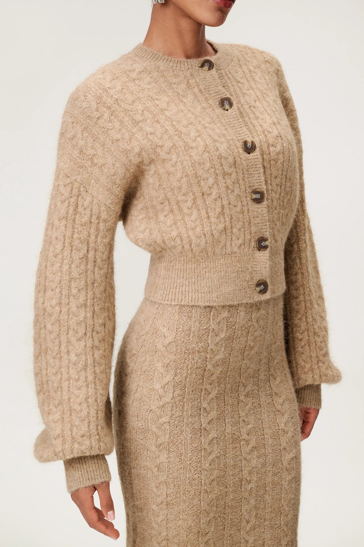 Merano Cardigan fra Adoore i beige melange er en kort strikk med moderne silhuett. Den har voluminøse pufferm og lave skuldre, mens ribbestrikkede mansjetter og liv gir struktur. Knappelukking foran tilfører et klassisk preg som fullfører uttrykket. For best mulig holdbarhet anbefales det å brette cardiganen i stedet for å henge den.