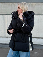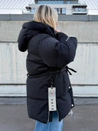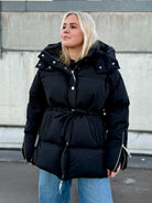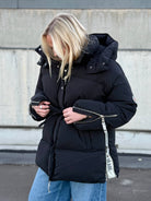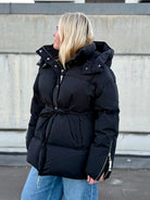 Jackie fra C.A.Y.A er en stilren og funksjonell dunjakke i klassisk sort. Den har avtagbar hette og kan tilpasses med knytebånd i midjen for en flatterende passform. Jakken er fylt med 90% dun og 10% fjær som holder deg varm gjennom de kalde månedene, samtidig som den er vannavstøtende og utstyrt med innvendige bærestropper for praktisk bruk. Funksjonelle splitter med glidelås i sidene gir ekstra bevegelsesfrihet, og logoen på ermet setter et sporty preg. Denne jakken er et perfekt valg både til byturer på vinteren og aktive dager på fjellet. Normal i størrelsen.