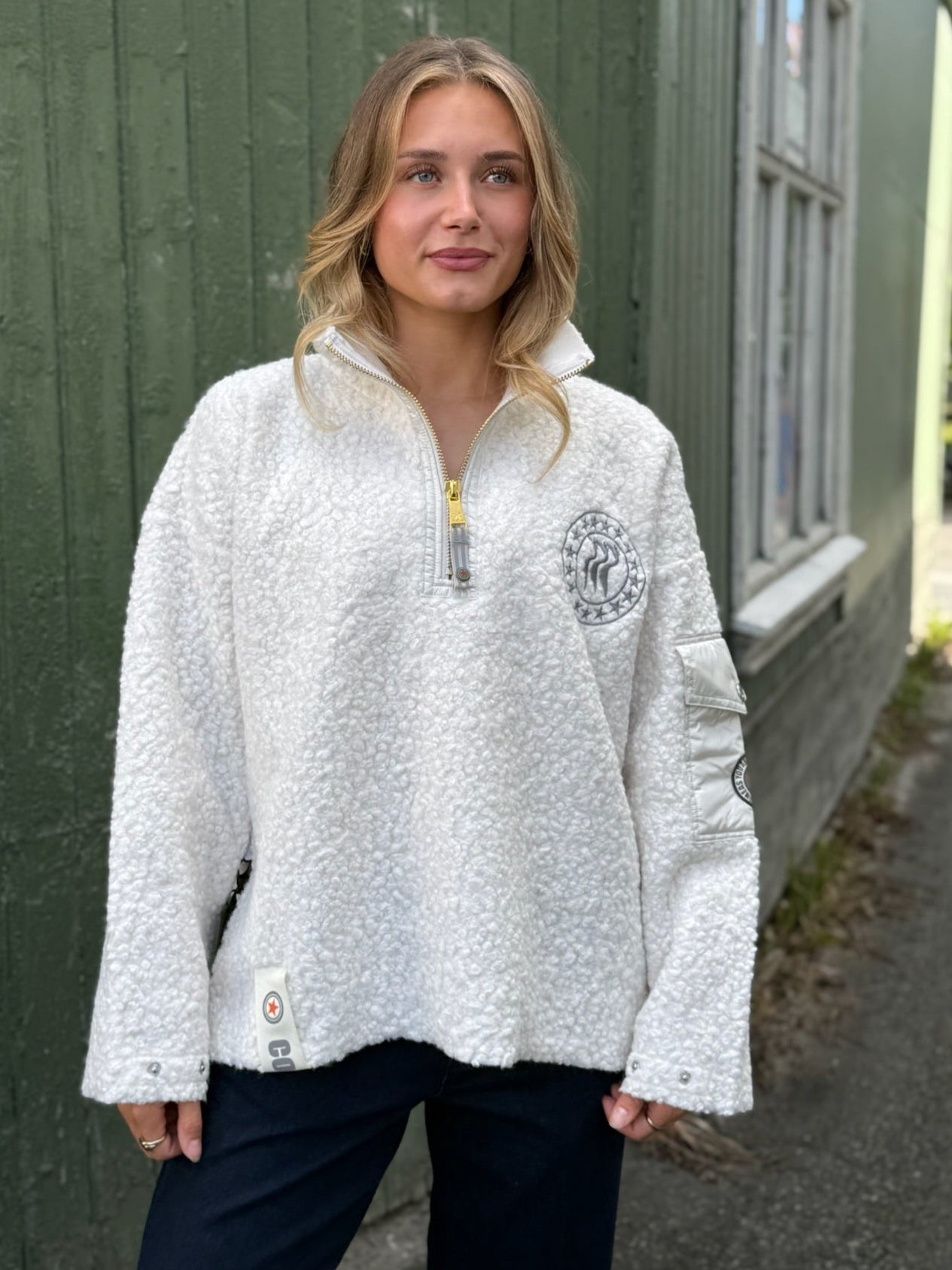 Nikki Half Zip Sweater White fra C.A.Y.A. er en myk og varm fleecegenser som holder deg komfortabel hele året. Genseren har en løs passform som gir et avslappet uttrykk, perfekt til hverdagsbruk.