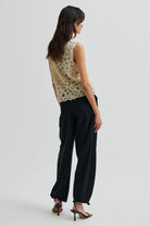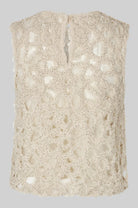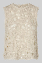 Gleam Top Summer Sand fra Second Female er en elegant topp dekorert med blanke perler over en ton-i-ton fôret bakgrunn. Den har et strukturert mønster, rund hals med nøkkelhulls-åpning og knapp i nakken, og en smal, rett passform.