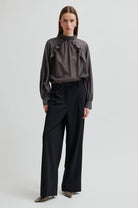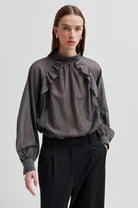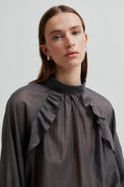 Kannika Blouse Beluga fra Second Female er en lett og luftig bluse i semitransparent materiale. Den har en elegant ståkrage med knappelukking i nakken og diagonale volanger som gir et feminint uttrykk. Raglanermene avsluttes med knappelukking ved mansjettene, mens den løse, flytende silhuetten skaper et sofistikert og behagelig fall. En tidløs bluse som passer like godt til jobb som til festlige anledninger.