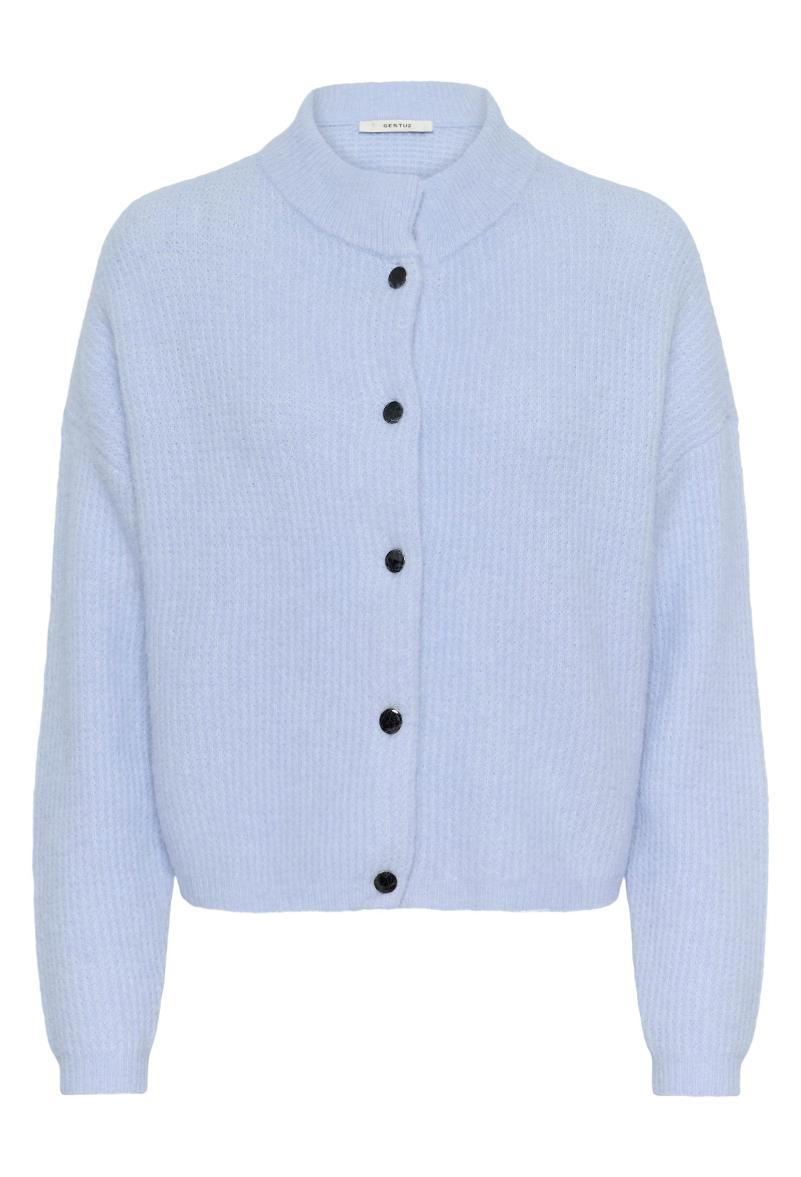 AlphaGZ Short Cardigan er en myk strikkejakke med knapper, høy ribbestrikket hals og droppede skuldre fra Gestuz. Laget i fluffy strikk med avslappet passform og lange ermer for komfort og varme.