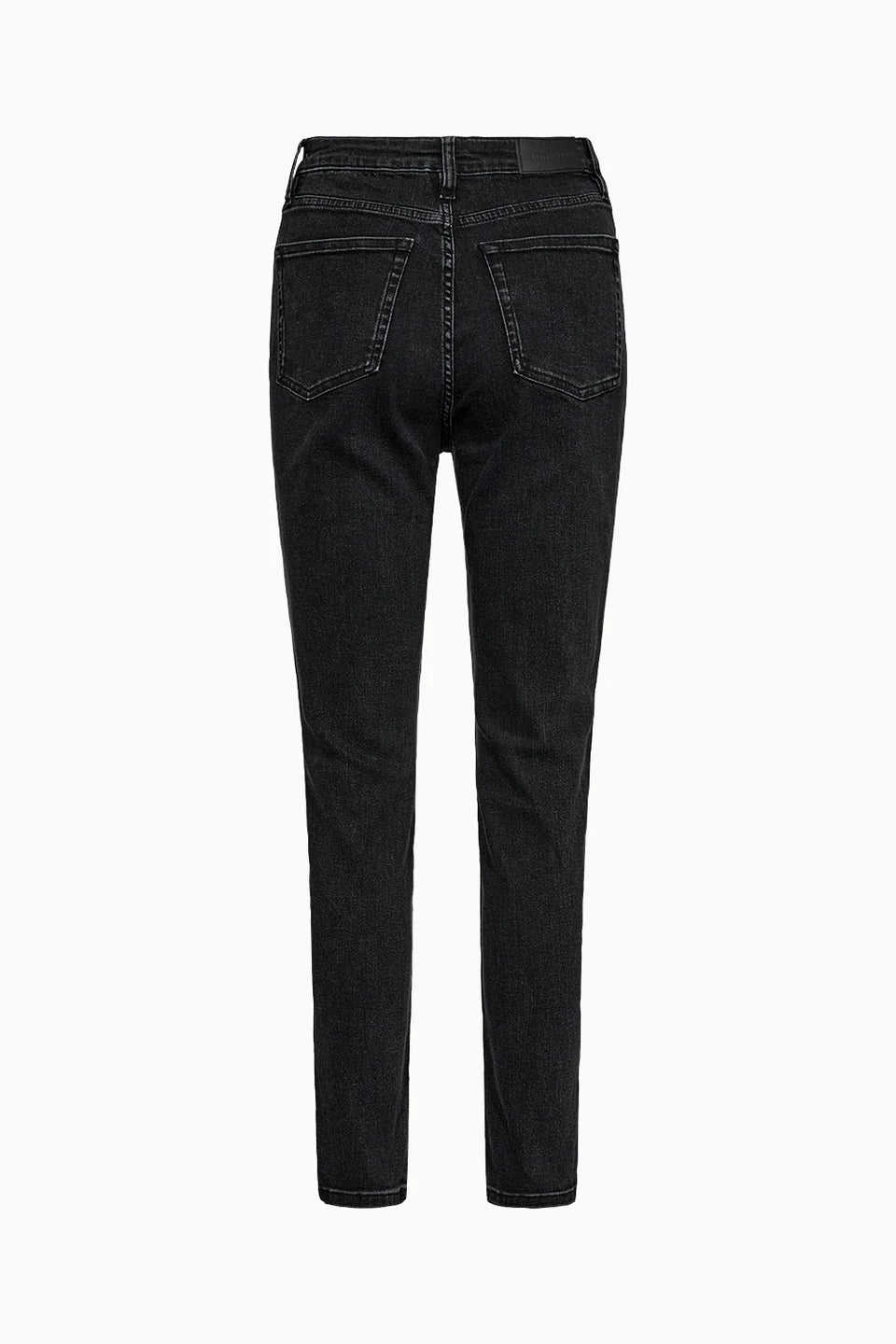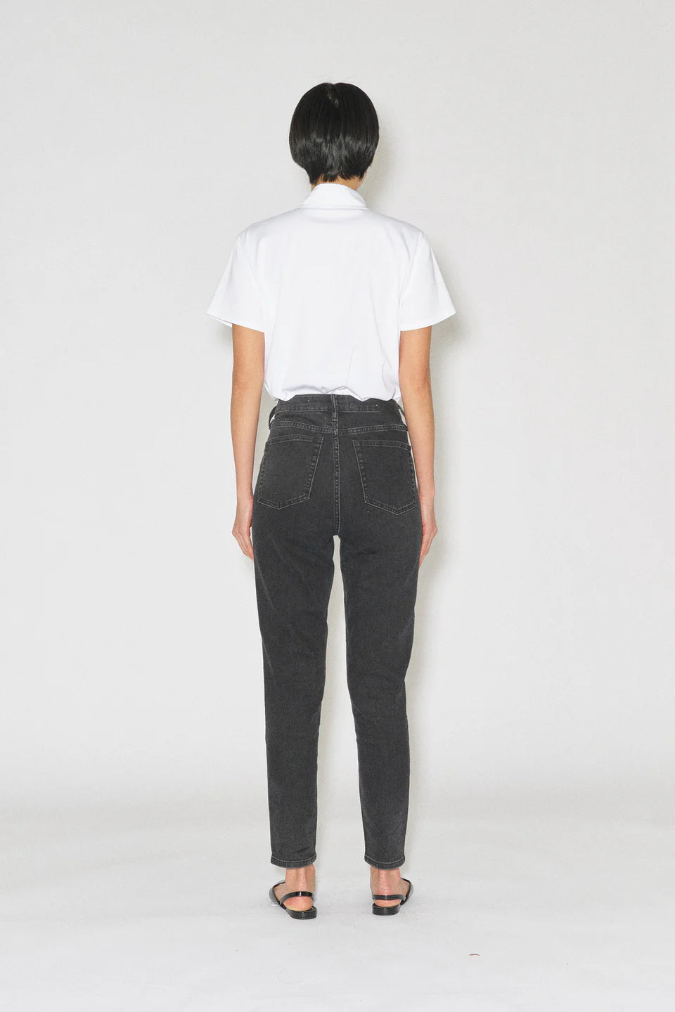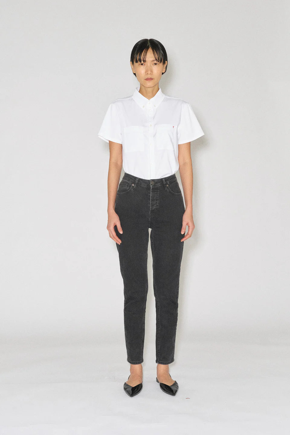 Hepburn fra Tomorrow Denim er en smal og tapered passform med knappgylf, som sitter komfortabelt rundt sete og lår og smalner ned fra kneet til bunnen. Det stive sorte denimstoffet vaskes ned for en mer autentisk slitt look.