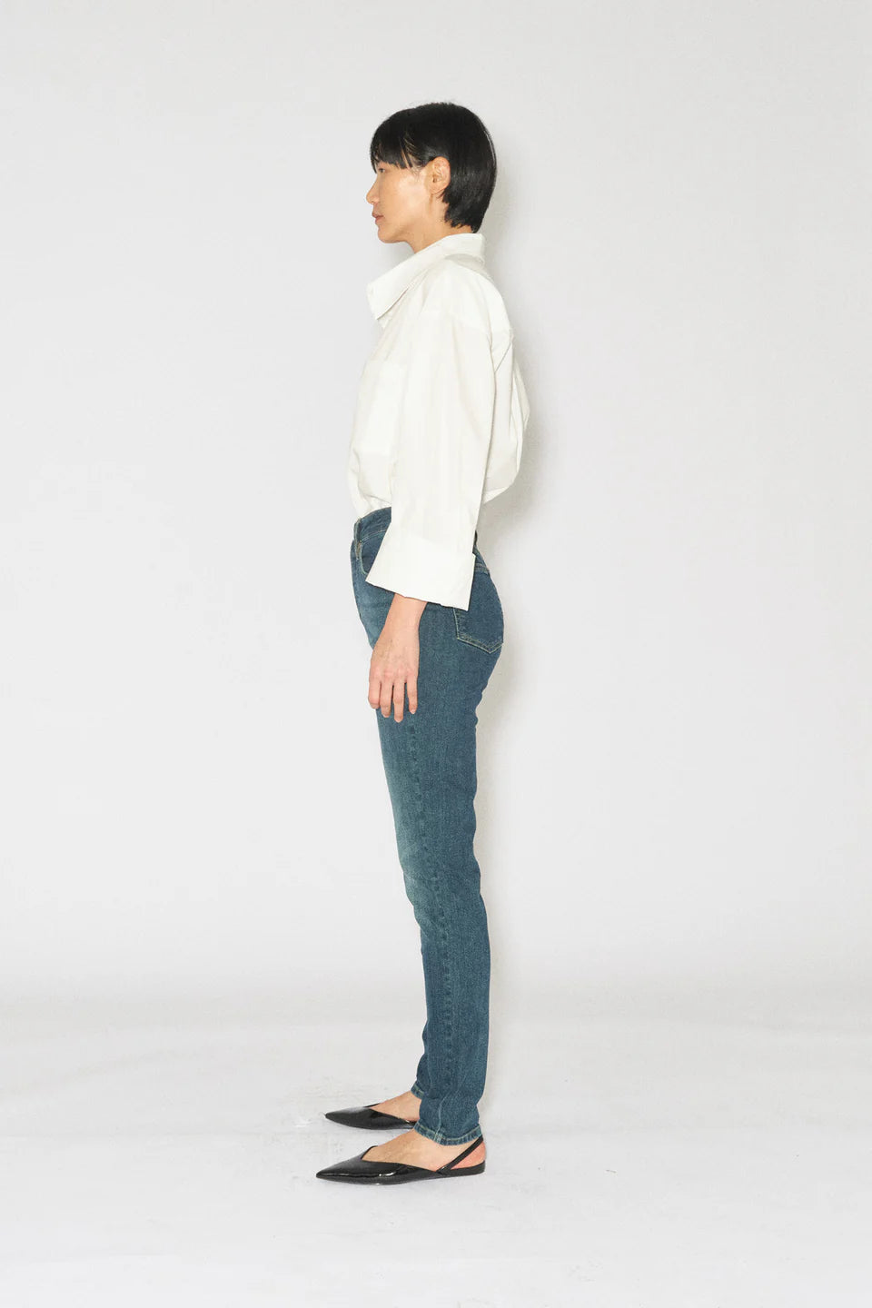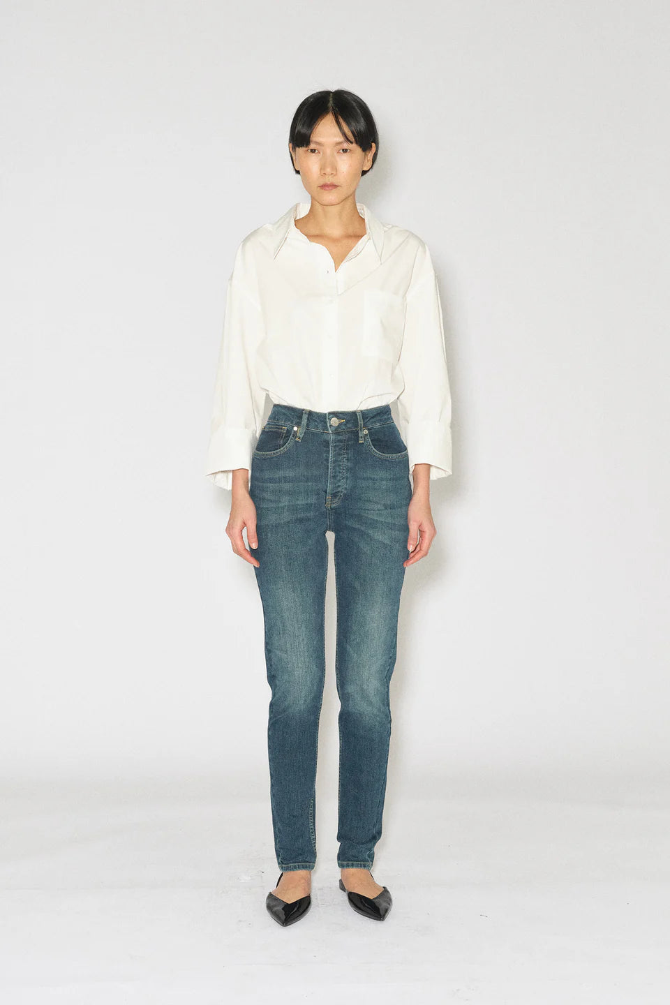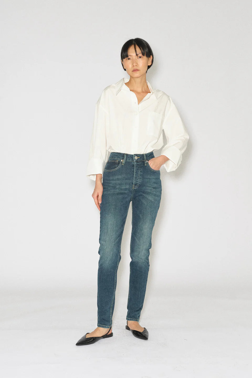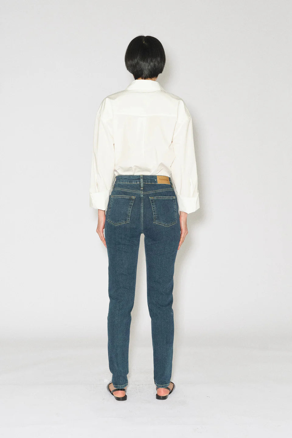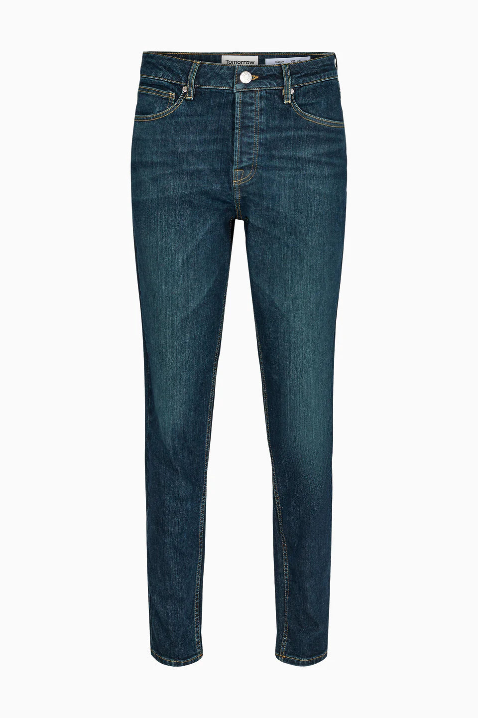 Hepburn fra Tomorrow Denim er en smal og ikonisk passform med knappgylf, som sitter komfortabelt rundt sete og lår og smalner ned fra kneet til bunnen. Det mørke dongeristoffet er vasket med lett slitt effekt med gule sømmer.