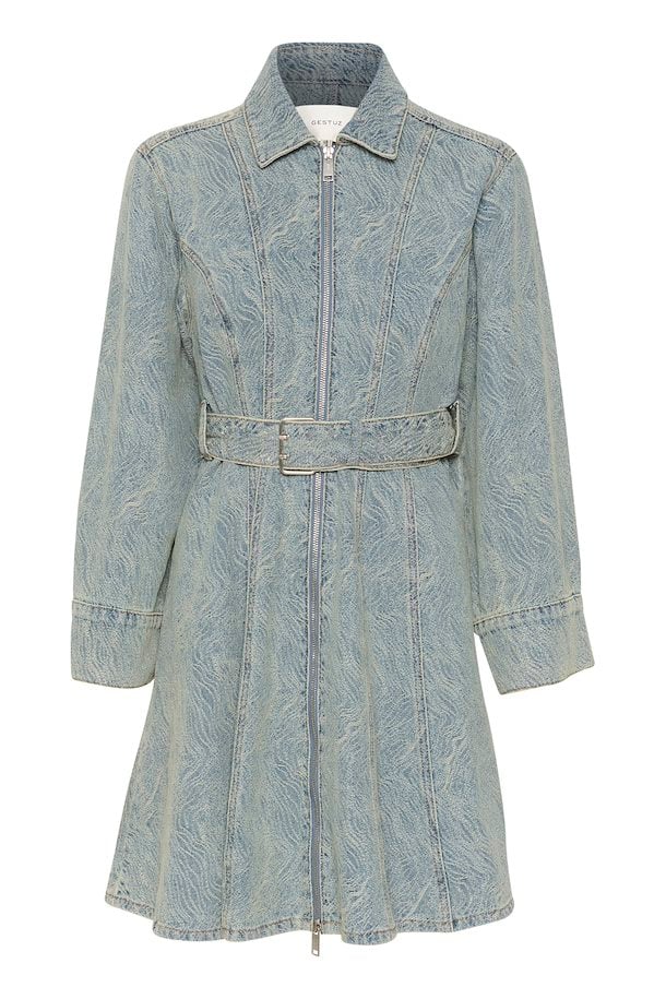 GiannaGZ Short Dress fra Gestuz er en kul statement kjole. Kjolen er designet i et mønstret denim stoff, og har glidelås i front, krage, og lange vide ermer. Kommer med et belte som kan tas av etter ønske.